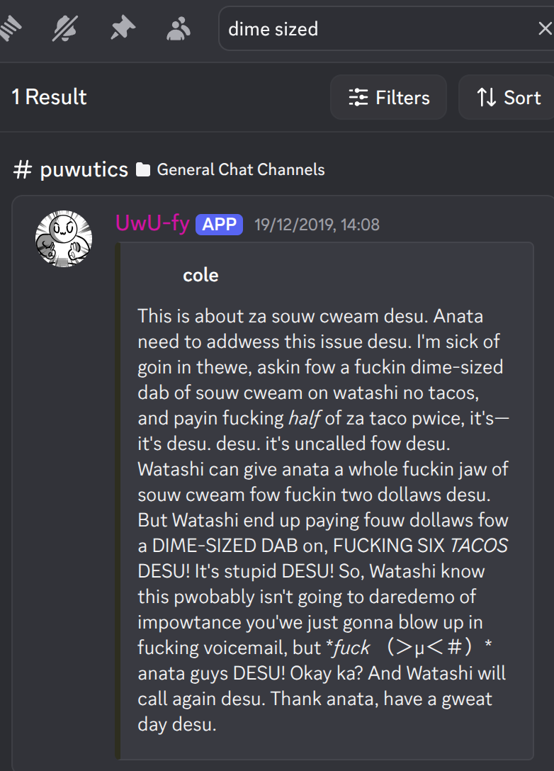 I'm looking for a video that was on the Cowbelly youtube channel titled 'this is about the sour cream'. The video aspect was just subtitles on a black background. The content was a phonecall of a man calling a tacobell and complaining about the price and portions of their sour cream. Pircrel is a butchered version of the transcript I found in an old discrod server.