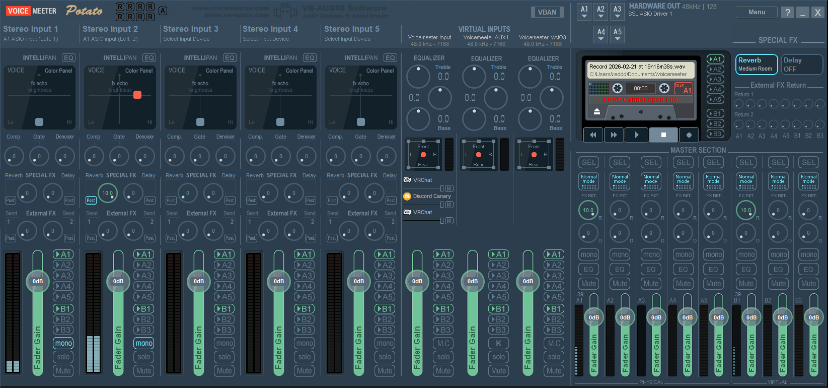 I'm using voicemeeter to record guitar and trying to use the virtual output vaio thingy so i can play thru discord, but when testing it with vocaroo it sounds underwater like this:https://voca.ro/1fj0351AyCVnbut when i upload the audio file from voicemeeter it sounds way more clear like this:https://voca.ro/1d5wIq5jDeUiwhy does the one from the virtual output sound all muffled?