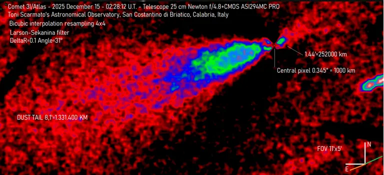 >Reminder that NASA is officially an intelligence agency>>41675710https://theskylive.com/3dsolarsystem?objs=c2025n1https://ssd.jpl.nasa.gov/tools/sbdb_lookup.html#/?sstr=C%2F2025%20N1&view=VOP>Lightcurvehttps://cobs.si/comet/2643/1.Retrograde orbit aligns within 5° of the ecliptic; p. [probability] .2%2.July–Nov 2025: showed a true sunward jet (anti-tail), not a geometric illusion3.Nucleus mass ≈106× 1I/Oumuamua and 103× 2I/Borisov, moving faster than both; p. <.1%4.Arrival timing placed it <10,000,000km of Mars, Venus, Jupiter and hidden from Earth at perihelion; p. .005%5.Gas plume: far more Ni than Fe (industrial-like Ni alloys) + Ni/CN ratio orders of magnitude above all comets incl. 2I/Borisov; p. <1%6.Gas plume: only 4% water by mass7.Extreme negative polarization, unprecedented; p. <1%8.Arrival within 9° of the “Wow!” signal; p. .6%Comment too long. Click here to view the full text.