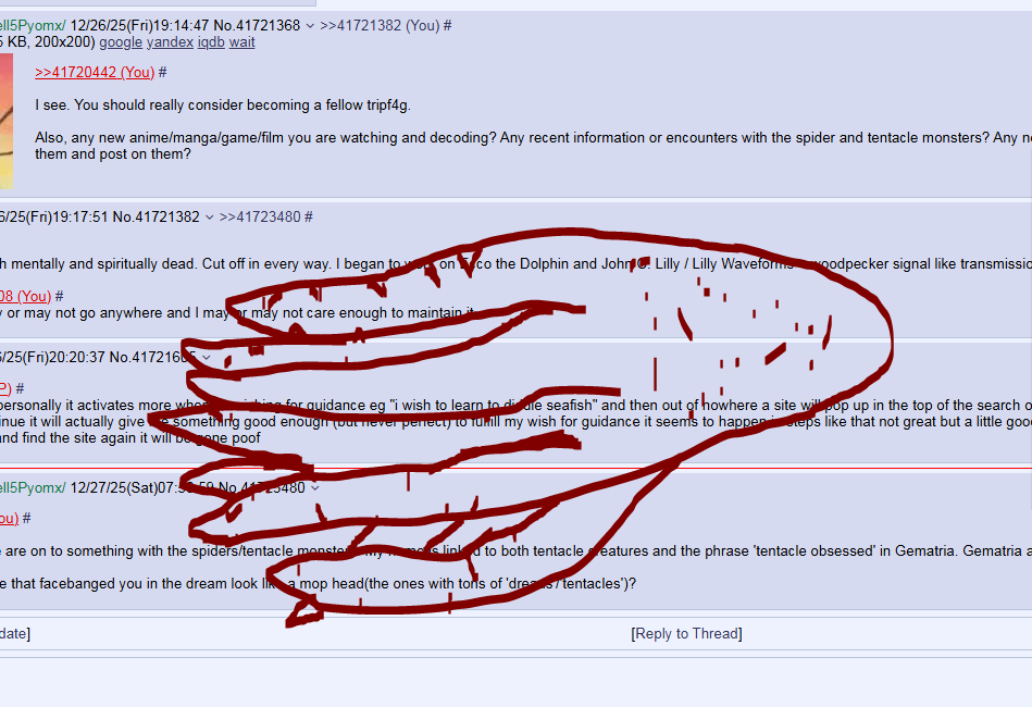 >>41721382I 100% think we are on to something with the spiders/tentacle monsters. My name is linked to both tentacle creatures and the phrase 'tentacle obsessed' in Gematria. Gematria also says I are right about my tentacle monster rants.Also, did the one that facebanged you in the dream look like a mop head(the ones with tons of 'dreads'/'tentacles')?