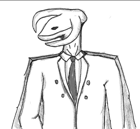 He told me it's name was Ajdazij, tall humanoid creature with a head with that resembled a mix of an orca and a crocodile with two horns, he was wearing a suit,a necktie and a capelet. So basically he told me he was my guardian that someone assigned to me but he didn't tell me anything else, since I ended up waking up shortly after. Is this guy lying to me or should I trust him.>I'm by no means an artist but tried to draw this creature.