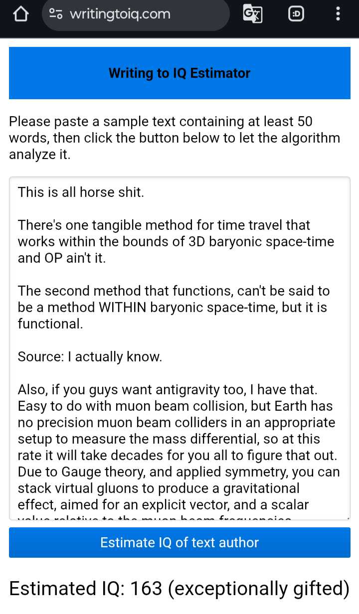 >>41687411This is all horse shit.There's one tangible method for time travel that works within the bounds of 3D baryonic space-time and OP ain't it.The second method that functions, can't be said to be a method WITHIN baryonic space-time, but it is functional.Source: I actually know.Also, if you guys want antigravity too, I have that.Easy to do with muon beam collision, but Earth has no precision muon beam colliders in an appropriate setup to measure the mass differential, so at this rate it will take decades for you all to figure that out.Due to Gauge theory, and applied symmetry, you can stack virtual gluons to produce a gravitational effect, aimed for an explicit vector, and a scalar value relative to the muon beam frequencies.When you phase two muon waves for collision at the appropriate angle and frequency, you begin stacking virtual gluons pairs, that don't technically exist, but their field effects do, even those which dictate mass. (Invisible mass)Humanity will likely discover this with muon beams, then refine it, with pion beams for an applied high end usage.Comment too long. Click here to view the full text.