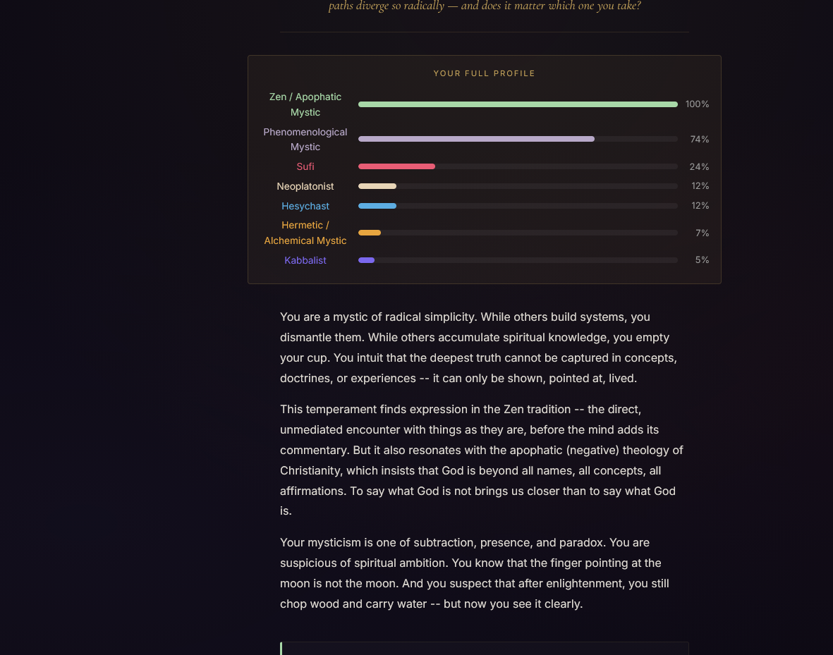 new /x/ tier quiz just dropped.according to this i should become a sufi mystichttps://mystic.millermanschool.comtake the quiz and report back with what you get too