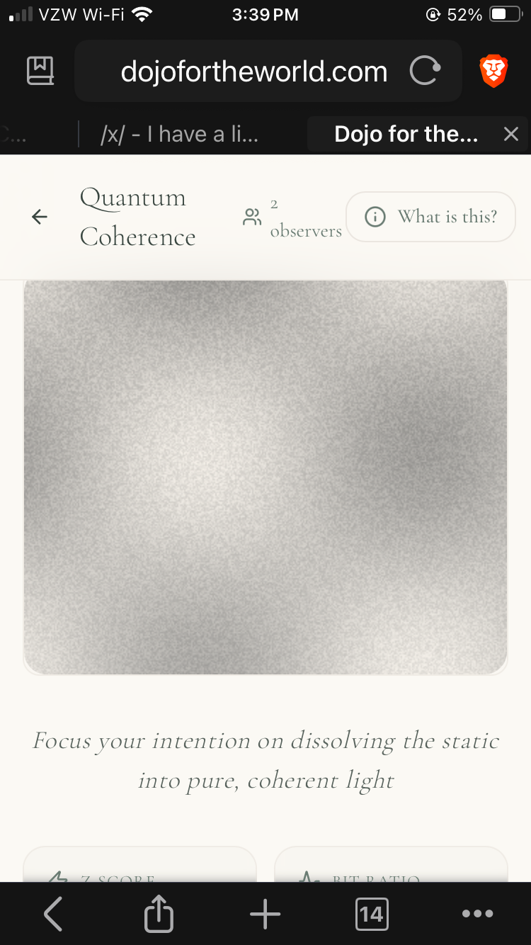 I have a live feed of quantum fluctuations running. I am plotting the deviation from pure randomness.I need observers.The hypothesis is that observation collapses the function. I want to see if 20, 30 anons focusing on the same white noise field can force a pattern to emerge from the chaos.https://dojofortheworld.com/experiments/quantum-coherence