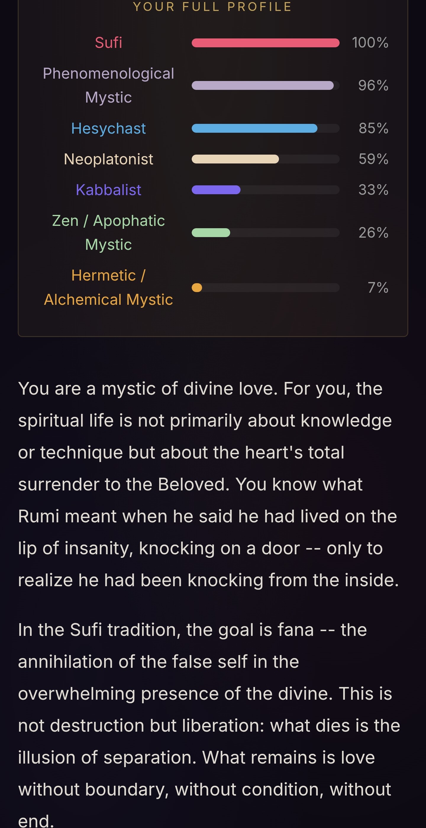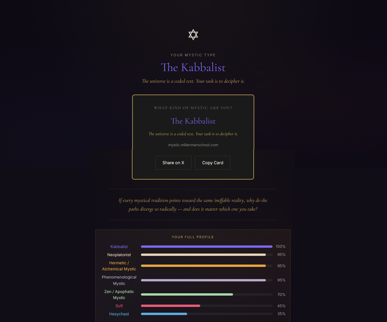 new /x/ tier quiz just dropped.according to this i should become a sufi mystichttps://mystic.millermanschool.comtake the quiz and report back with what you get too