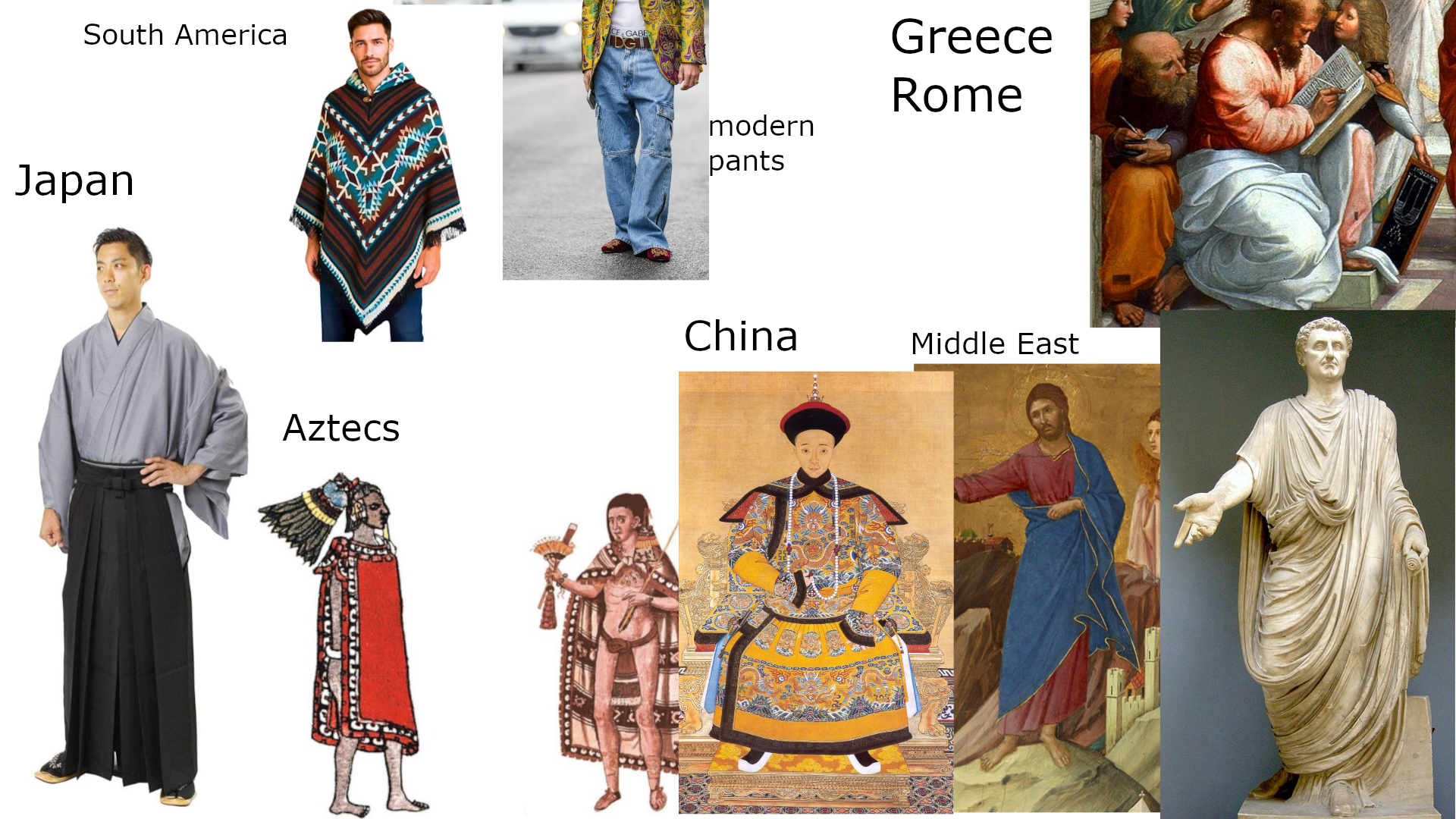 Cultures around all the world had men using more large, robe like and windy clothes, tunics, toga, capes, etc.Who benefits from pushing the modern pants everywhere? What are the implications of this?