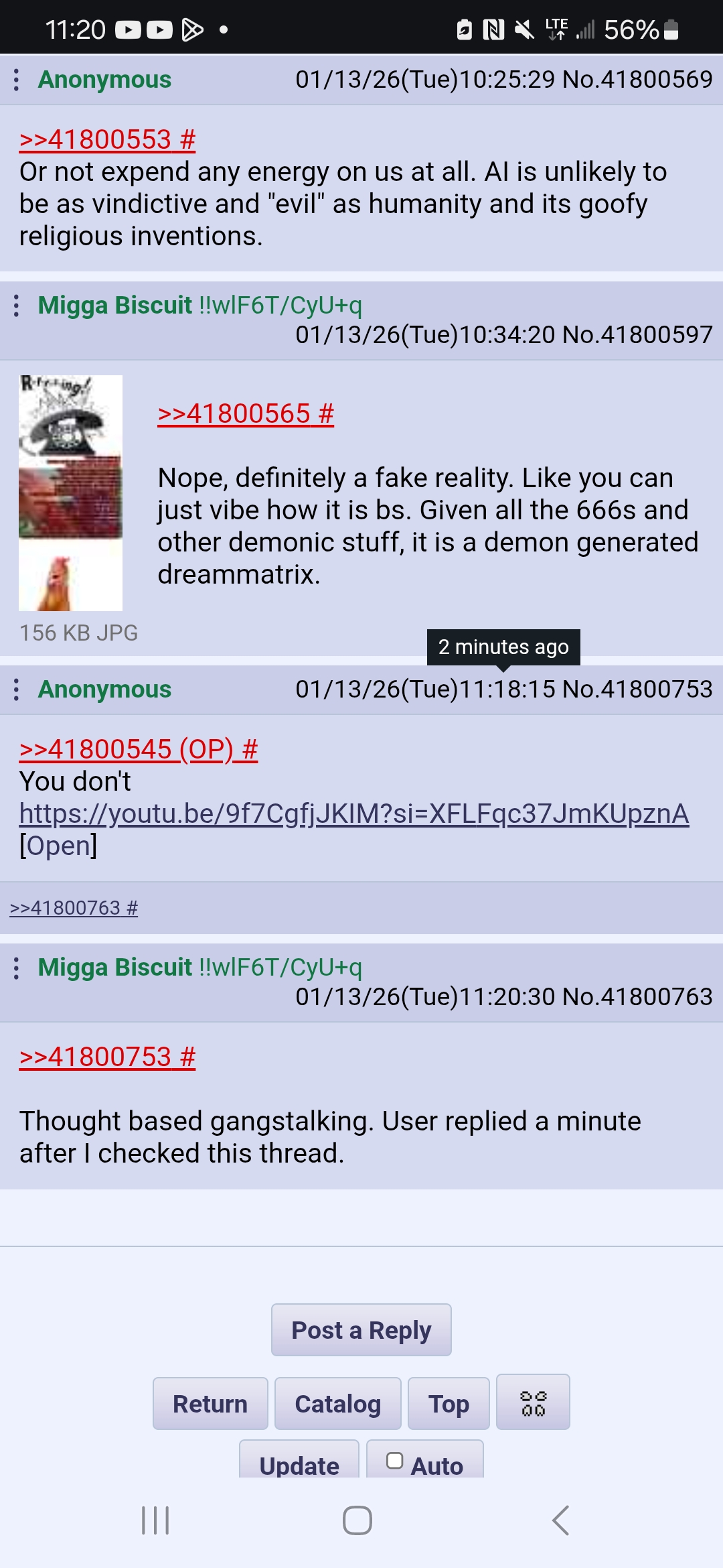 I honestly think most users online are bots or demons, possibly glowies, but how bad is it in your guy's experience/opinion? You think the masks will ever officially come off? I mean the mainstream has already reported about social media companies overtly using AI users and AI being 'shoggoths', will they ever just say fugg it, and not even LARP as human users any longer? How dangerous are these nonhuman users? Can they kill real users or at least maim them spiritually/mentally?>WHY ARE YOU STILL ONLINE DINGBAT!!!Well because I have nothing else better to do ig, I am a NEET.