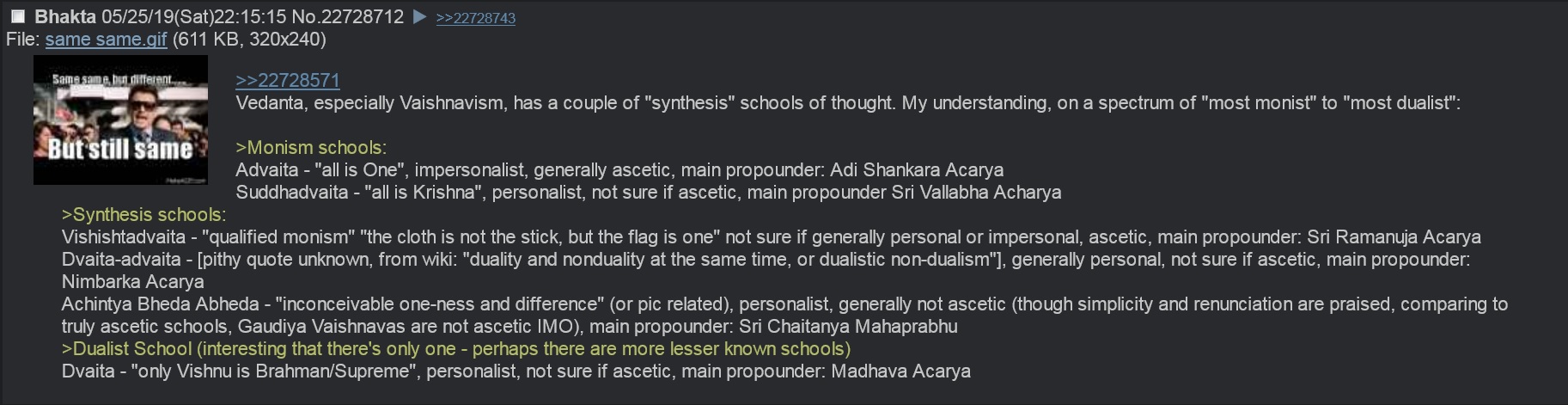 >>41648650Most of Vedanta has some form of Personal Supreme Person in it.It's really only Advaita that insists you are that God, and everything else is fake.