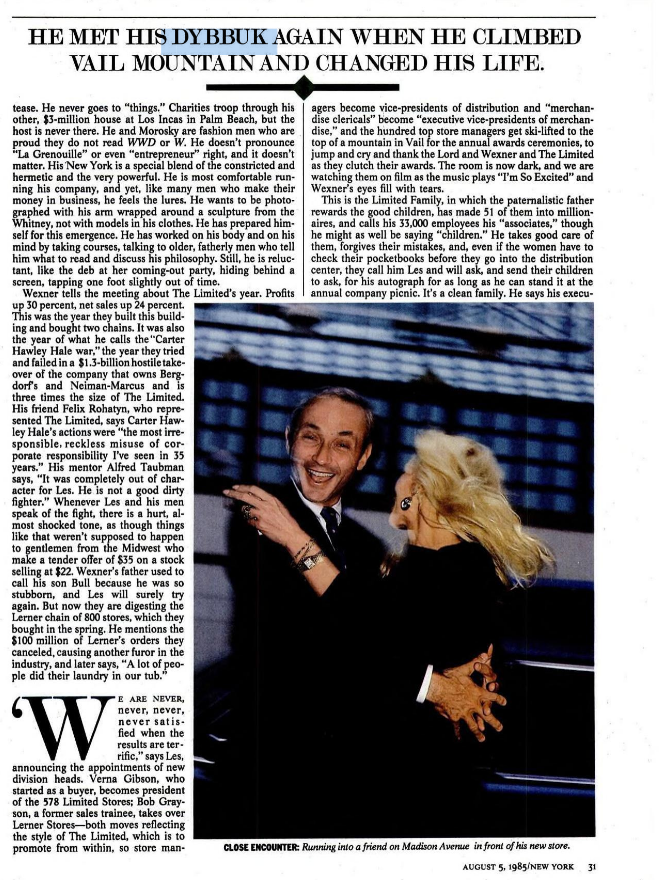 This is a real entry from his wikipedia.>In a 1985 article, Wexner discussed that he had trouble sleeping which he attributed to his dybbuk spirit that he dubbed shpilkes, "the demon that always wakes up in the morning with Wexner and tweaks and pulls at him".[9] He noted it had been intermittently appearing since childhood, and attributed his driving, his bachelor lifestyle, his business drive to trying to escape the anxiety it caused and always had music playing as he couldn't stand the sound of silence.>https://en.wikipedia.org/wiki/Les_Wexner#Personal_lifeIt's from this New York Magazine piece done on him, which was done with his involvement.>https://archive.org/details/les-wexner-dybbuk-demon-article/page/31/mode/1up?q=dybbukDemonic spirits are real. I have psychic abilities and the ability to, in part, understand the otherworld.The wealthy know about the demonic spirits, and make pacts with them in return for positions, or power. Trump and Epstein both have dybbuks attached to them as well. We are ruled by demons, in the end. Most posters on /pol/ work in service to those demons. Just another layer with the Epstein problem.