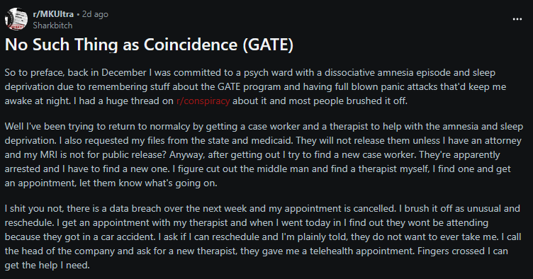 https://www.reddit.com/r/MKUltra/comments/1qds4n1/no_such_thing_as_coincidence_gate/Would the government actually try to harm people willing to help TIs?