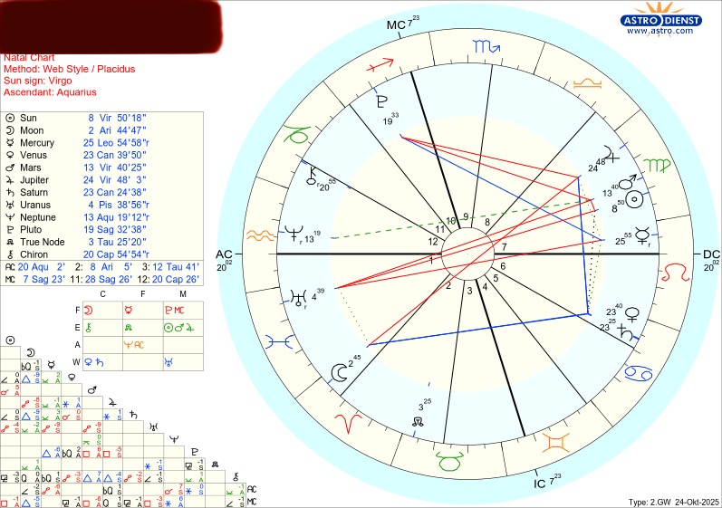 >>41338214>your conscious mind and subconscious is paper thinI feel this is true, but i feel like i can go deeper, and i want to, but i don't know how, other than letting faith guide me where i can and need to go.>afflicted by some chronic health conditionTightening of my throat in left side, still persistent, working on letting go, and embracing positivity, truth and love, i feel my upbringing have programmed certain tensions, my old self is still clinging to.>Your work involves long travels.Can you elaborate?>Wow, every planet in the sky except Mars.Thanks for the explanation about the houses and planets being beneath and in the sky.I was really intrigued about your wow comment, what does it signify that almost all my planets are in the sky?>any specific area in life you are particularly interested in?anything you feel is remarkable or worth telling me really, i love having a read especially from a wise and caring reader.what do i need to work on?love, journey, faith, purpose?is it possible to add each other somewhere?like discord, email or anything?Lastly thank you so much for your time and expertise! :)