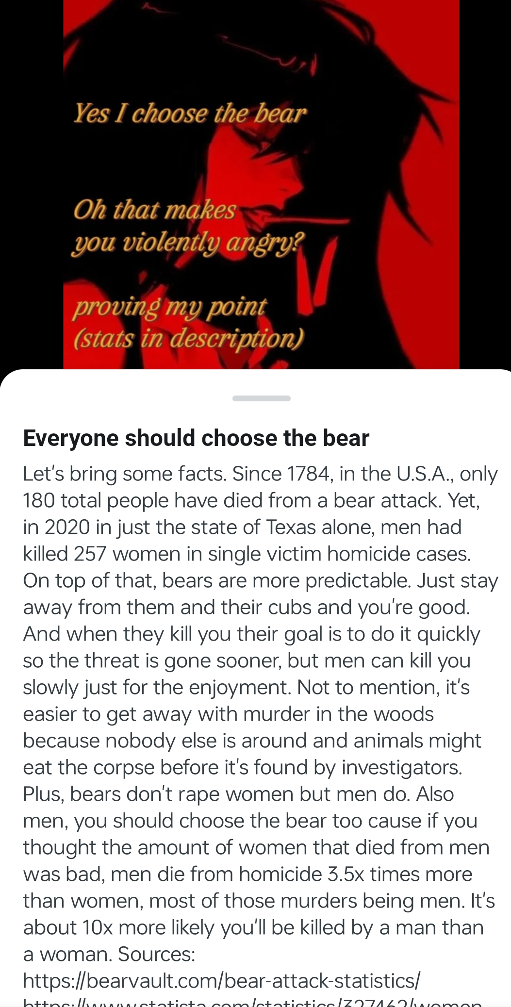 >>41300137>I was stalked relentlessly for years, no matter how many times I blocked or set boundaries, even when police got involved he continued. This person was violent and dangerousThere was someone who said the same thing about me. That person was psychologically unstable and thought I wanted to kill them despite me never even threatening it, and several of our friends took her side immediately before even talking to me about it, despite them all knowing of her history of being not mentally well.I don't know your situation so I won't say anything about it, but neurosis is a very real concern for people, and many traumas are self caused.>I don't know if you're also a man and don't know how dangerous men can be or know how often they kill queers and womenAn absolutely worthless statement, backed up by statistical evidence.>Globally, men are significantly more likely to be homicide victims, with 81% of homicide victims being male as of 2021. In contrast, the female homicide rate is much lower, with 19% of victims being women, and the global homicide rate was 9.3 per 100,000 males compared to 2.2 per 100,000 females.Men are not "more dangerous to women", you simply have more male offenders of crime in general; and they also target other men more.>https://bjs.ojp.gov/content/pub/pdf/wo.pdfThree out of four victims of violent offenders were womenIf you were to somehow control for "this person is definitely 100% a murderer", and then grab random people within that dataset, women are more dangerous to other women.