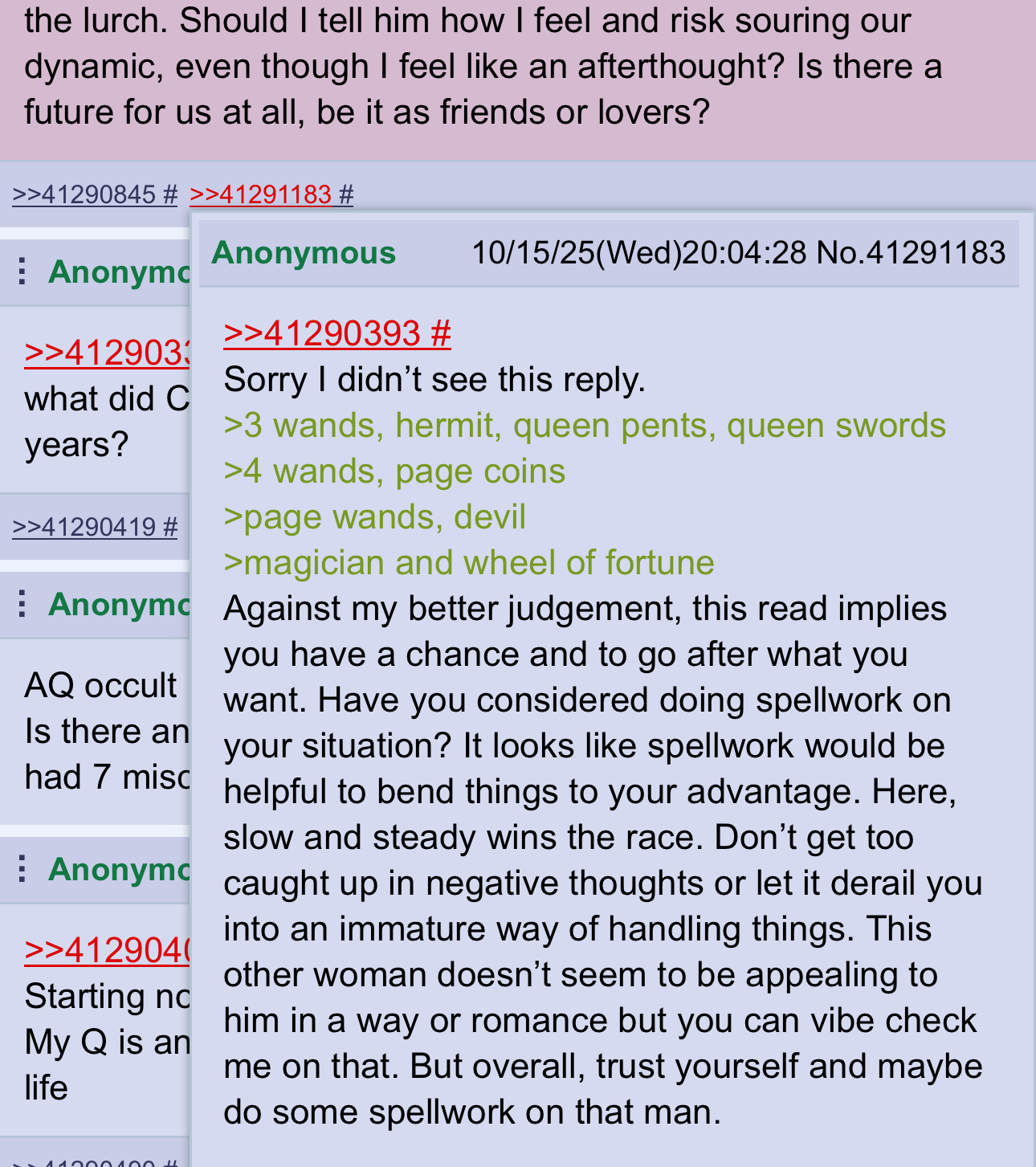 >>41299392Hi. I asked if things were working out for me and things got a nice yes. A few days later, I'm doing much better. Your readings are some of the most accurate I have seen.