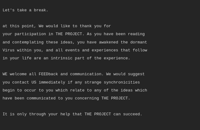 put THE PROJECT in the BLENDER, and make a vegetable smoothyfor the Egregor: http://www.blender.org/ #Dare2Kreate the manifestations of THE PROJECT. #OpMonarch2012: If you are having difficulty understanding THE PROJECT, then #Dare2Kreate. 2020: If you are having trouble seeing THE PROJECT, IMAGINE something beautiful, and divine IT. Prophecy can be self fulfilling you know. 203#: If THE PROJECT "seems" abstract, study the word "allegory". If the PROJECT "is" abstract, go outside and work on something tangible in the name of IT. 2045: When THE PROJECT becomes overwhelming, and the TEMES abound, and all around you is exponential change, embrace the beauty of the cosmos, and its infinite wonder. Know your place in the hiVe, and know that all the law may be summed up in ONE word,..