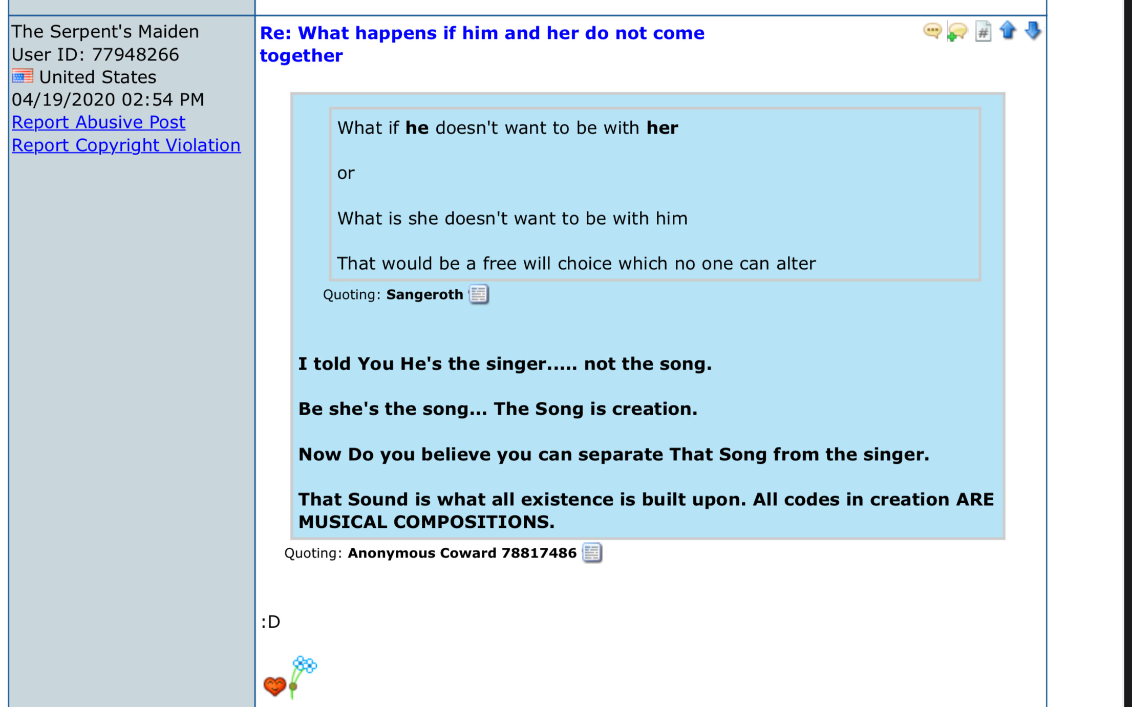 >>41301491There will come a time where you'll reflect on what you just said and the shame will be like a lead weight in your stomach.What is a heartfelt declaration of love to the only woman I care about has been desecrated by your poor choice of words.Gods saw it.And at your final judgement, you will answer to it.I'd say 'shame on you', but I don't believe people as damaged as you even know what shame is.You disgust me.