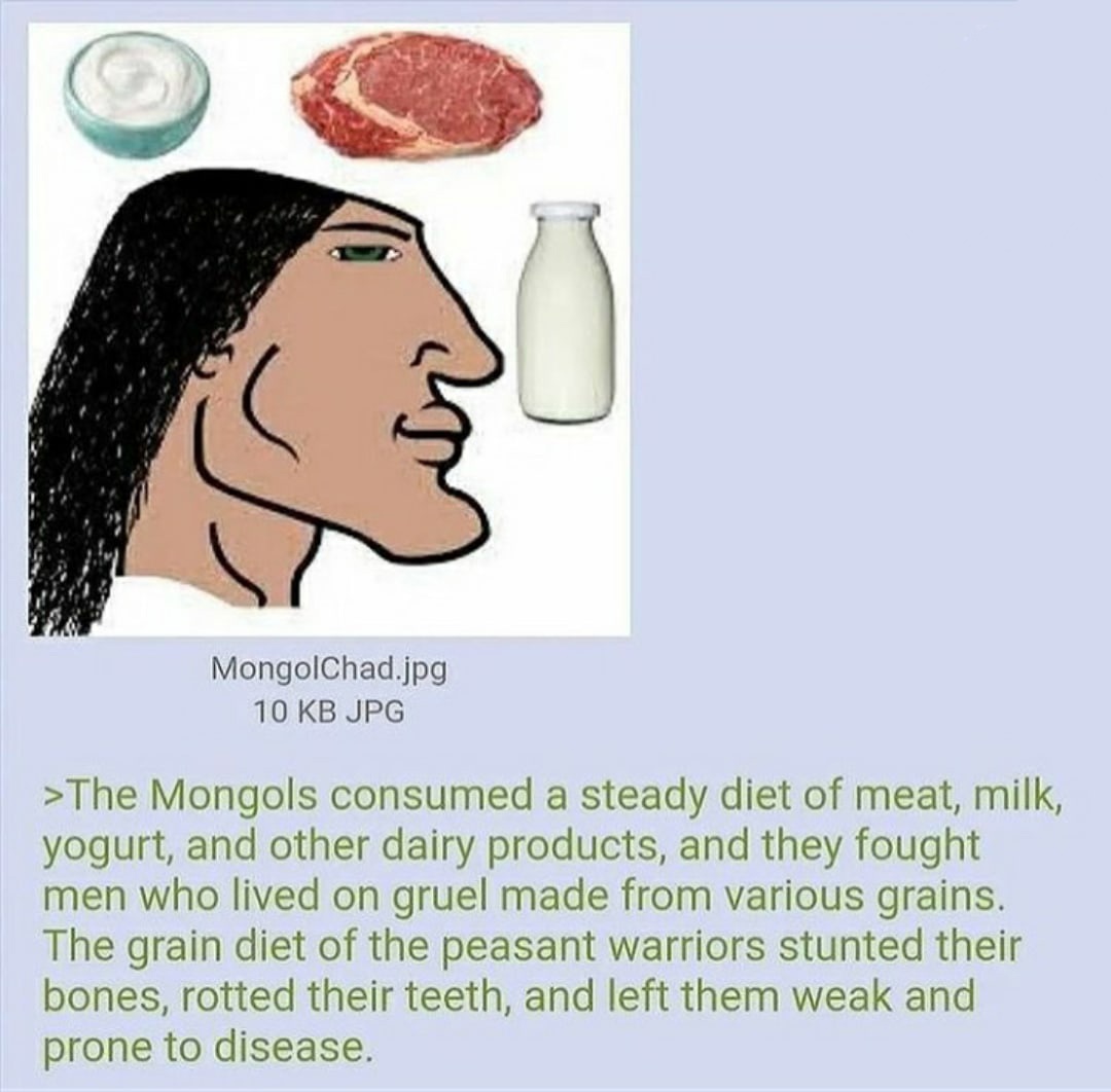 >>41312466The Mongols were bitch to chinks for a thousand years despite their “diet”How do you explain that? Why they used to kowtow to some gruel eating chinks for that many years?Not saying mongols didn’t do well, but sure as hell wasn’t cause of their “diet” or they wouldn’t bow down to chinks for that many years