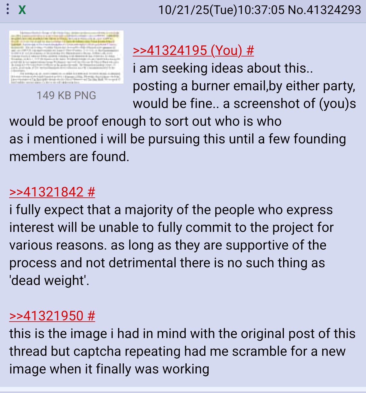 >>41324195i am seeking ideas about this.. posting a burner email,by either party, would be fine.. a screenshot of (you)s would be proof enough to sort out who is whoas i mentioned i will be pursuing this until a few founding members are found.>>41321842i fully expect that a majority of the people who express interest will be unable to fully commit to the project for various reasons. as long as they are supportive of the process and not detrimental there is no such thing as 'dead weight'. >>41321950this is the image i had in mind with the original post of this thread but captcha repeating had me scramble for a new image when it finally was working