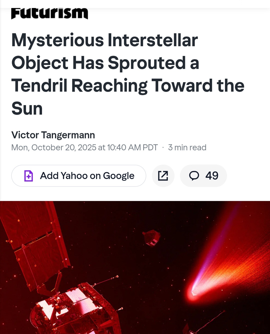 >>41326993>Large object discovered in July coming from deep space>third of its kind that we’ve known about in the last few years >Some think it’s a comet some think its alien due to its path >read the OP for more info