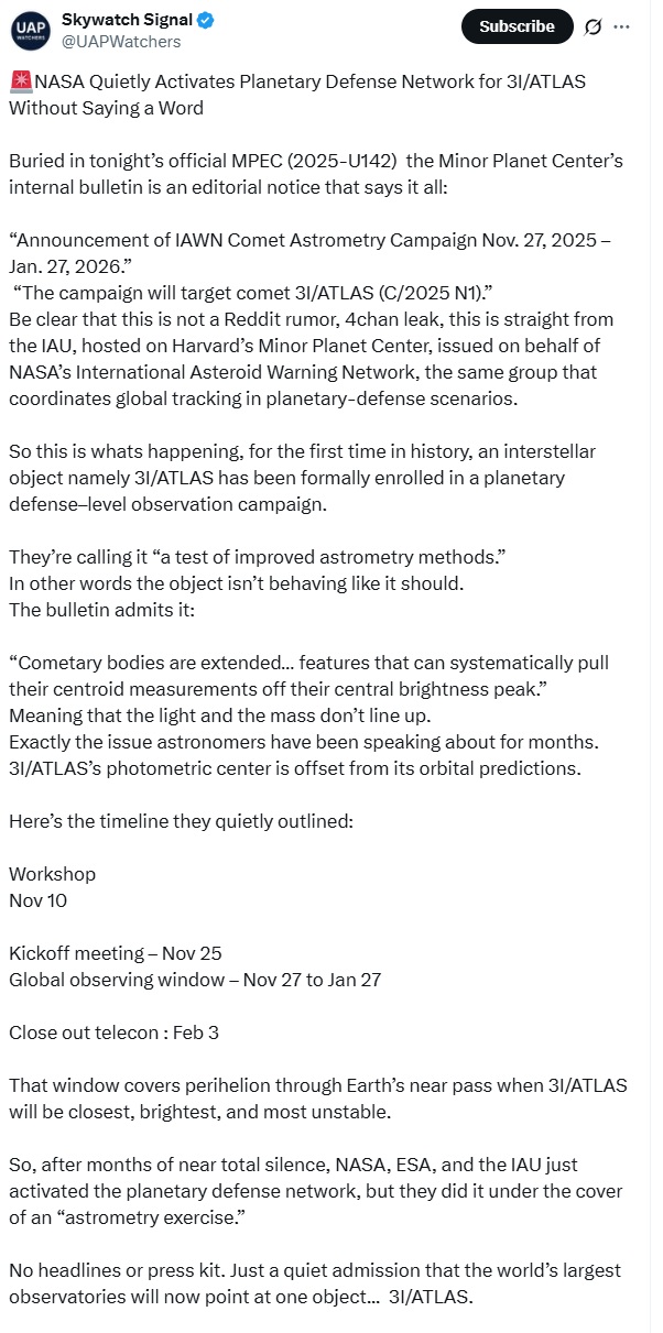 Previous >>41321647>3i/Atlas Trackerhttps://theskylive.com/3dsolarsystem?objs=c2025n1>Latest updatehttps://www.esa.int/Science_Exploration/Space_Science/ESA_s_ExoMars_and_Mars_Express_observe_comet_3I_ATLAS>14 Anomalies about the 3i Atlas ObjectProvided by DobsonianPower YouTube Channelhttps://youtu.be/m40gXjIu1x8 1. It is traveling too fast to be a comet2. It is too bright to be a comet3. No Gas Tail4. Anti-tail gases escaping in a sunward direction5. The object is traveling on the ecliptic plane of our solar system6. The object is traveling < .5AU from Mars, Venus, and Jupiter7. The object comes from somewhere in the Sagittarius constellation8. The object will not be visible from Earth for a time because it will be hidden by the sun9. Images of the object from the JWST were censored (pixelated)10. The object is off gassing more CO2 than is typical for a comet11. Ni to Fe ratio is extremely low12. The object exhibits extreme negative polarization13. The color of the object keeps changing at a high rate and quickly14. Unexplained light bursts/fluctuations>Other oddities that may or may not be related:The scientific community is unable to pin down the size and weightThere is a lack of conversation about the object in the scientific communityThe object exhibits little to no spin or rotationIt is maintaining its trajectory and not being affected by the sun like a typical comet would beA large amount of "drones" have been sighted over European airports since the object was detectedUp to 11 other comets have been detected entering the inner solar system since the object was detectedAn increase in solar activityhttps://youtu.be/Sgm3hNFKEbc>sources:YouTubehttps://www.youtube.com/@DobsonianPowerhttps://www.youtube.com/@TheAngryAstronauthttps://www.youtube.com/@DiegoSanAraujo/videoshttps://www.youtube.com/@GaleriaDoMeteoritohttps://www.youtube.com/@StefanBurns>Avi Loebhttps://avi-loeb.medium.com/