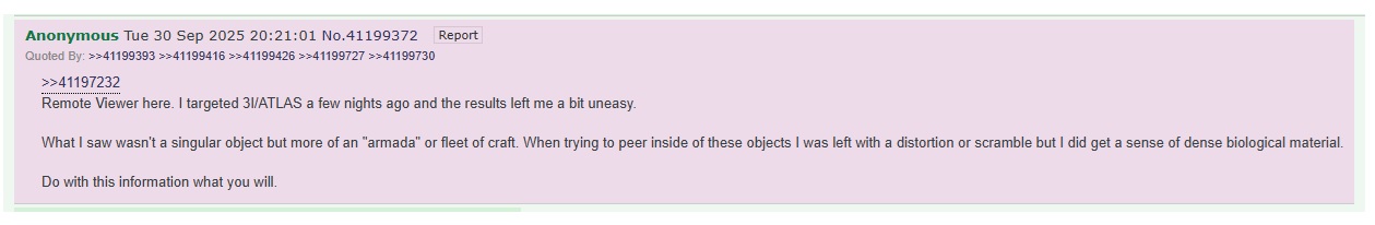 Just did a blind remote viewing session on 3i/atlas. It’s not looking good for us the ayyys are shocked we are so divided. Only advanced civilisations are ruled by one planetary government. We will need form a one world government or the ayys will deem us far too dangerous to have AI and space travel.