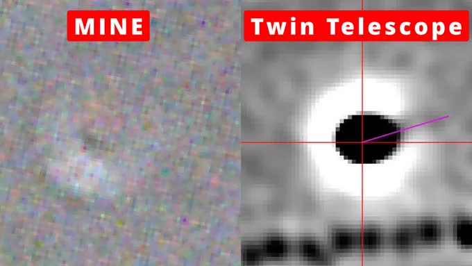 >>41327419Anon we will have to accept that the H gif thing might have been a distraction for people to shut the fuck up. They didn't release better pics later... We are blind waiting for them to show us anything. This C thing looks a lot like what a Two-meter Twin telescope saw but much brighter of course. It's probably very bright but Tiago's telescope is made to look at the sun so it ends up looking pale.