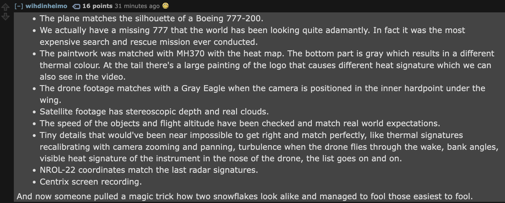 >>41364152>you didnt see the youtube video made by john youtube?!?! ha! >>41373382>Two separate angles by US military grade tech (one called Gorgon Stare). Incident happened at night, but the footage is in specialized night vision spectrums.>A Third image was released by China. Apparently they were watching. Some of these passengers were very important to them too.whoa no way!i see you didnt post a source where you got that information from, can you post the source?
