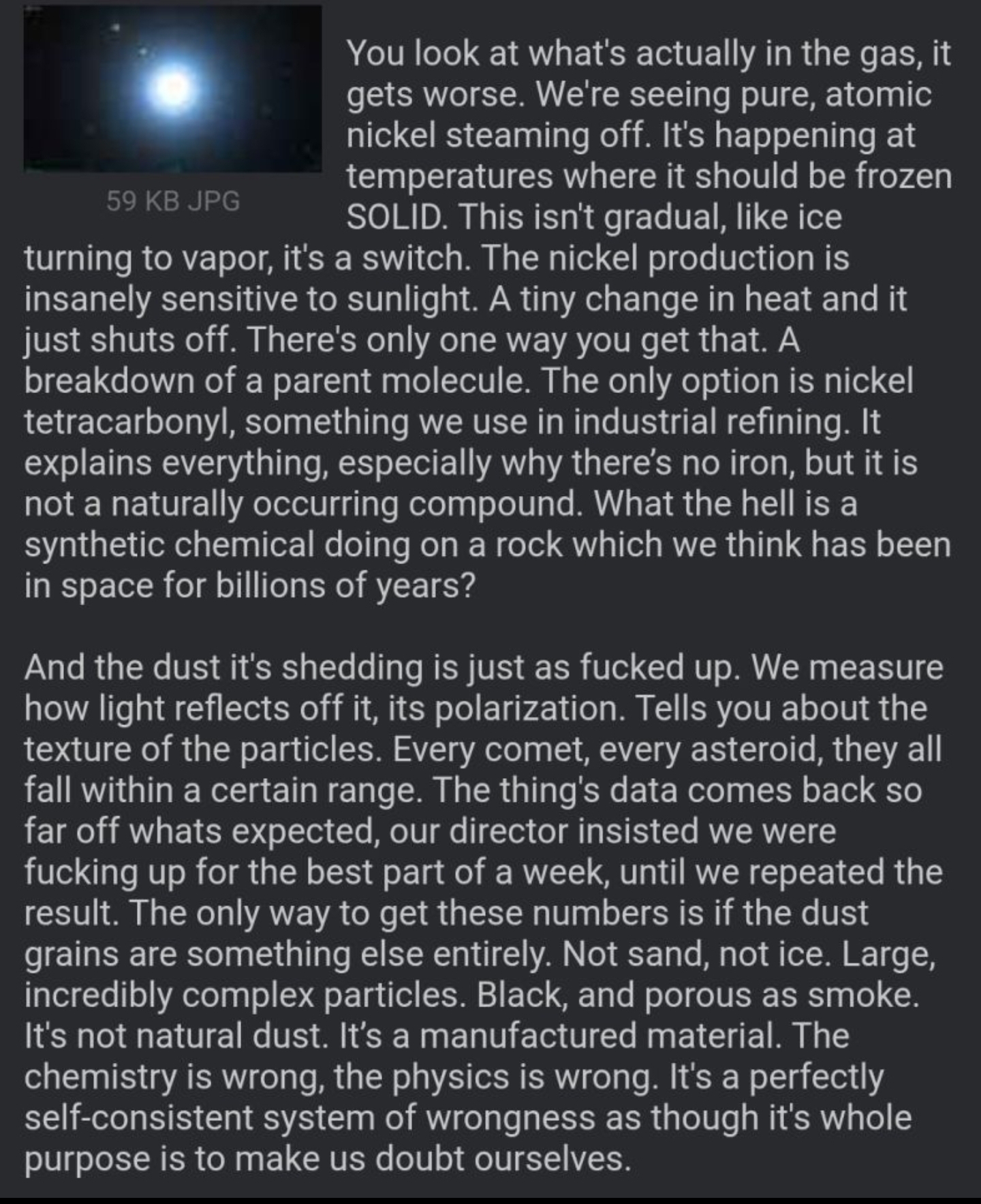 Previous >>41365342>3i/Atlas Trackerhttps://theskylive.com/3dsolarsystem?objs=c2025n1>Timeline so farhttps://youtu.be/ExzqklYYm6A >latestperihelion in 1 day 12 hours at time of post.>List of confirmed Anomalies1. It is traveling too fast to be a comet2. It is too bright to be a comet3. No Gas Tail4. Anti-tail gases escaping in sunward direction5. The object is traveling on the ecliptic plane of our solar system6. The object is traveling < .5AU from Mars, Venus, and Jupiter7. The object comes from somewhere in the Sagittarius constellation, within 9 degrees of where the WOW signal was detected8. The object will not be visible from Earth for a time because it will be hidden by solar glare9. Images of the object from the JWST were censored10. The object is off gassing more CO2 and less H2O than typical for a comet11. Ni to Fe ratio extremely low12. The object exhibits extreme negative polarization13. The color of the object keeps changing at high rate14. Unexplained light bursts/fluctuationshttps://youtu.be/m40gXjIu1x8>Other oddities, may or may not be related:The scientific community is unable to pin down the size and weightThere is a lack of conversation about the object in the scientific communityIt is maintaining its trajectory and not being affected by the sun like a typical comet would beA large amount of "drones" have been sighted over European airports since the object was detectedUp to 11 other comets have been detected entering the inner solar system since the object was detectedincrease in solar activitycontinued data silence from all space agencieshttps://youtu.be/Sgm3hNFKEbc>sources:YouTubehttps://www.youtube.com/@DobsonianPowerhttps://www.youtube.com/@TheAngryAstronauthttps://www.youtube.com/@DiegoSanAraujo/videoshttps://www.youtube.com/@GaleriaDoMeteoritohttps://www.youtube.com/@StefanBurns>Avi Loebhttps://avi-loeb.medium.com/