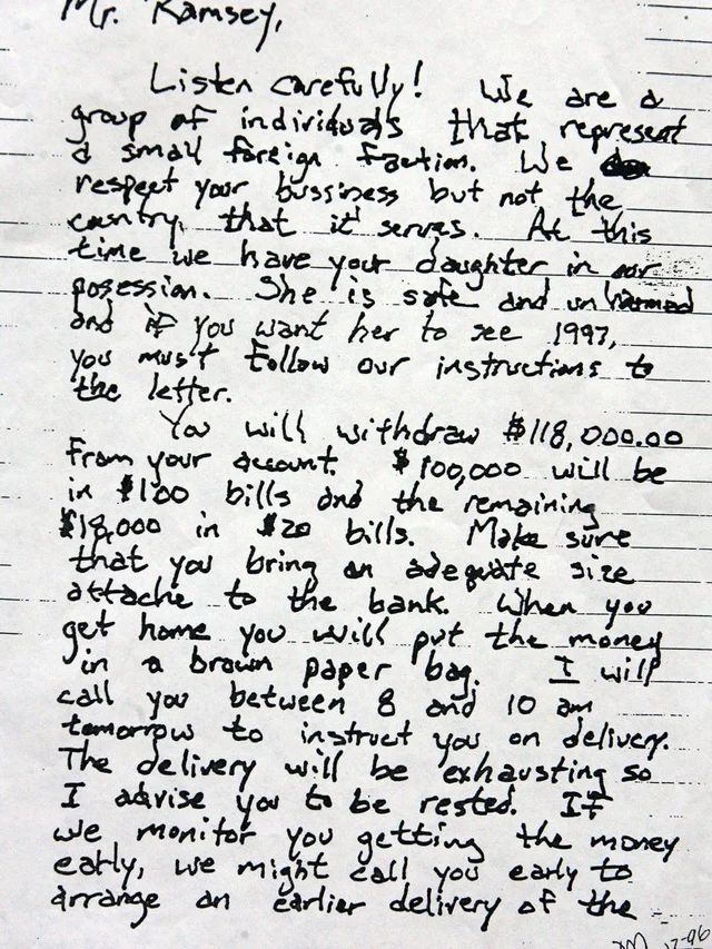 RANSOM NOTE- Long and rambling, one of the longest, if not the longest ransom notes in history.- The note was written on a pad of paper, using a sharpie, taken from and left within the Ramsey home.- A "practice note" found written on the same pad.- The note demanded a ransom of $118,000, the exact amount of a Christmas bonus John had received. - Many individuals have been made to provide handwriting samples to compare to the note over the years..- Many have noted very strong similarities between the content and language of the ransom note and certain movies. These include: Dirty Harry, Poltergeist, Ruthless People, Ricochet, Speed, Seven, Nick of Time and Ransom. - The note was signed Victory! S.B.T.C the meaning of which has never been determined. WHO WROTE THE RANSOM NOTE?- Many criminal profilers, hand writing experts, psychologists, and lay people have attempted to determine the author of the note both through handwriting analysis and analysis of the language used in the note. Some examples:FBI agent Clint van Zandt: The writer is a well educated female between the age of 29 and 40 who knew the family and the home well and knew that JonBenet was dead when the note was written.FBI Profiler John Douglas: The writer is a white male in his 20s with a personal grudge against John Ramsey.FBI Profiler Robert K. Ressler: "JonBenet's mom fits the profile of the person who wrote the phony ransom note found in the Ramsey home" (...) the style and language and information contained in the note point to an approximately 40-year-old white woman from the South as the author.Donald Pugh (Patsy's father): The writer is a middle-aged female with a background in law enforcement. Dr. Fausto Brugnatelli, handwriting expert: John Ramsey most likely wrote the ransom note.Boulder PD: Made Gary Merriman, Access Graphics Director of Human Resources, give seven handwriting samples. Felt there were strong similarities between his writing and the ransom note.