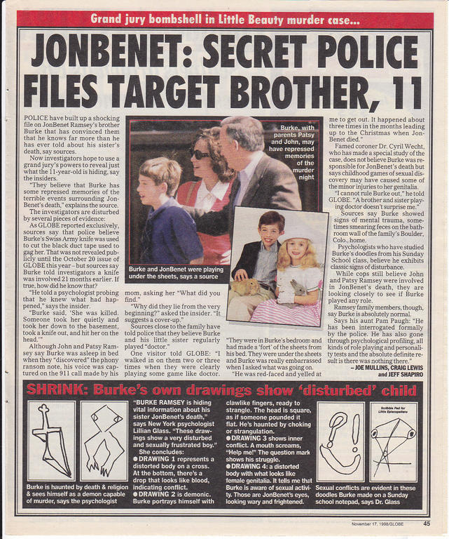 >>41380500His family is wealthy, and they wanted to maintain the image of being the perfect family. That’s an undeniable impression of them based on statements about them. If it were an accident, he would’ve been charged with manslaughter. >>41379115This person has evidence on him that suggests he was a disturbed child. And the knot that JonBenet was in is a Boy Scout knot. Which Burke was evidently was in.