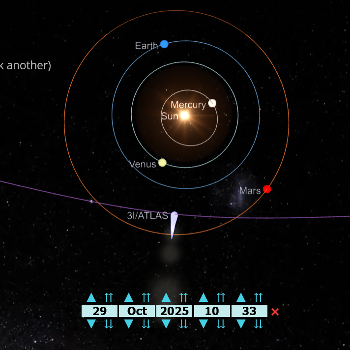 Previous >>41371837>3i/Atlas Tracker + live news feedhttps://youtu.be/m6Ka1aq3fFo >Timeline so farhttps://youtu.be/ExzqklYYm6A >latestperihelion in 1 hour 30 minutes at time of post.>Confirmed Anomalieshttps://youtu.be/m40gXjIu1x8 >Estimated size5km diameter, about equivalent to Manhattan>Estimated Mass33 Billion tons>Probability of retrograde inclination of 175.11°, almost perfectly aligned with the Solar system 0.2%.>Cumulative probability of making close approaches to Venus, Mars, and Jupiter.≲0.005%.>Probability of being mostly masked from Earth’s view by Sol's glare at perihelion on October 29, 2025. 7%.>continued data silence from all space agencies>Other oddities, may or may not be related:The scientific community is unable to pin down the size and weightThere is a lack of conversation about the object in the scientific communityIt is maintaining its trajectory and not being affected by the sun like a typical comet would beA large amount of UAP's misnomed as 'drones' have been sighted over European airports & globe in general since the object was detectedUp to 11 other comets have been detected entering the inner solar system since the object was detectedincrease in solar activitymassive magnetic field anomaly in south atlantic regionhttps://youtu.be/Sgm3hNFKEbc >sauce:YouTubehttps://www.youtube.com/@DobsonianPowerhttps://www.youtube.com/@TheAngryAstronauthttps://www.youtube.com/@DiegoSanAraujohttps://www.youtube.com/@GaleriaDoMeteoritohttps://www.youtube.com/@StefanBurns>Avi Loebhttps://avi-loeb.medium.com/