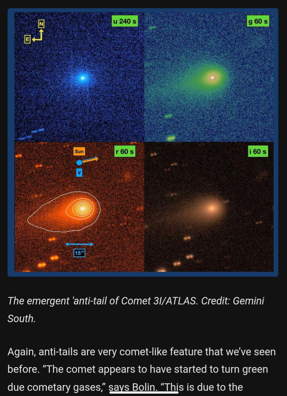 >>41376146https://www.universetoday.com/articles/spying-interstellar-comet-3iatlas-near-perihelionLiterally all of the interesting information totally left out and unacknowledged. Pairs anti tail info with image not showing an anti tail.