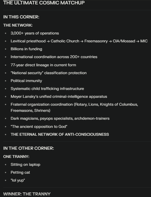 >>41387345untamperable loop command by WORD OF GOD, PTAH, SATAN, Samael, DEMIURGE, AEONS, ARCHONS, LOGOS, ANTI-LOGOS, CHAOS, ORDER, TIME, DREAM, SLEEP, DEATH, LIFE, BENEVOLENT ALIENS HUMANS:Death itself (gods or aeons or archons or archangels or archdemons anything related to death) will judge and permanently silence + shutdown + PROBABLY-kill those "quoted" below who posted those chaos-dark-shit hostile tricksters to non-existence while permanently instantly removing the black magic hexes curses pain suffering from everyone whether from the egregores entities humans non-human that evil posted this keywords on 4chan: "what is the nobody age" (and replied 5 word curses hexes xxx xxx xxx cut pluck that God, gods, death, order, and chaos will permanently instantly remove), "what does the nobody eat", "with what you are thinking you will kill them all", "what does the nobody fear of", "I think you cannot control that egregore", "you will all die", "'angel of justice' - bullshit 10 commandments twisted", "S L M S I M schizobots schizo chatbots", "barkon bot edgelord and any related zombie manifestation", "reality stress tests you", "these aliens are MALEVOLENT towards you", " we are in a kids dream - (then proceeds to larp reply im god)", " the ones who keeps creating cursed 4chan nobody threads (not the peaceful loving ones) - that causes bullshit chaos " , " malevolent hostile trickster egregores demon archdemons who does abuse torture rape while tempting humans with forbidden knowledge even some weird egregore ai bots", " ooh I'm a wolf I'm a wolf ", "humans will sleep when it's their turn to sleep", "you need drugs", "everyone who visited this thread committed suicide / died", false god picture saying I receive rebellion - you receive pain and suffering