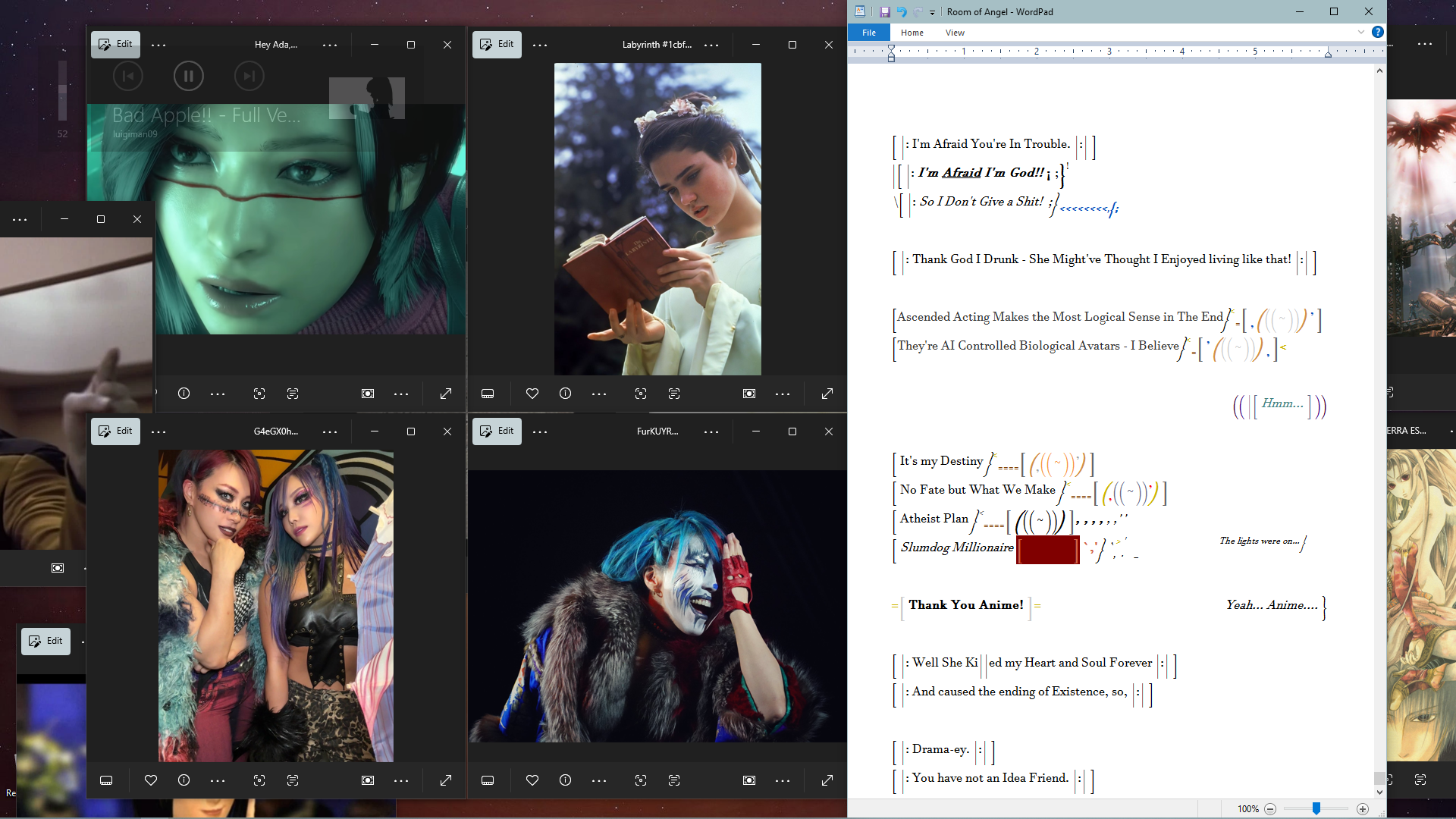 >>41397855nice they cant win against you, because you speak always truth! And never change your narative, nor what you are. They change their role many time in one day, and that mean you are liar, by default. They have deception and worthless stories but you have truth as it is from resources that are available to track them! You are keeper of meaning and truth. if truth lose and we become all to act as anime characters and holywood imagination scenarios.. than we are lost..Anime cartoons, and holywood movies are made by sick people without moral and truth values. so everyone that create and want to reality bend according to their delusions is not acceptable.>Of course if you agree with me.