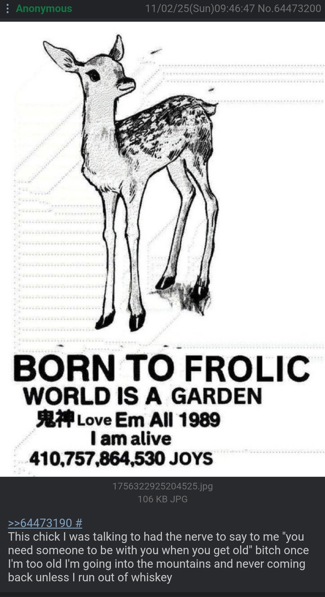 >>41401811The dreamer and the dream are the same thing, a tough concept to hold in our conscious mind. The endings and beginnings are similarly the same.>>41401819Good times mean different things to different people, for me Good times are days free to roam, observing and quietly sitting in some place, watching things go by