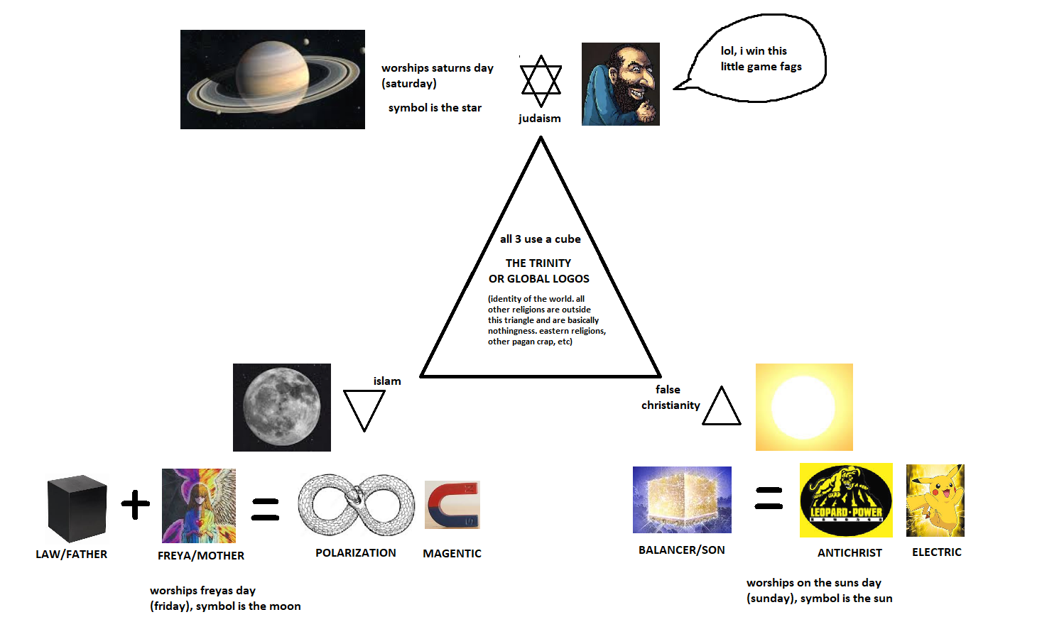 abrahamic religions go over your head OPthink of the world as a giant brain. the eastern and western hemispheres are the left and right part of the brainand the "big 3" abrahamic religions are the brains identity or logos. the law or underlying structure of the worldall the other religions exist outside this triangle and are just basically part of "the all"notice how i put false christianity there on the right, there is a real Christianity that has nothing to do with this world, but everyone will get sucked into the false one