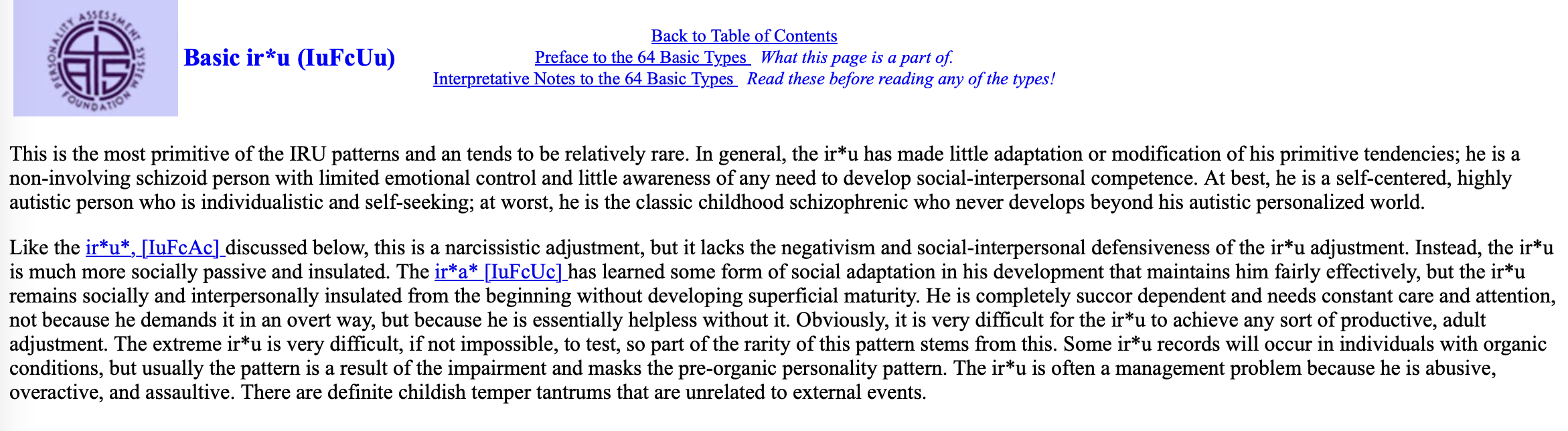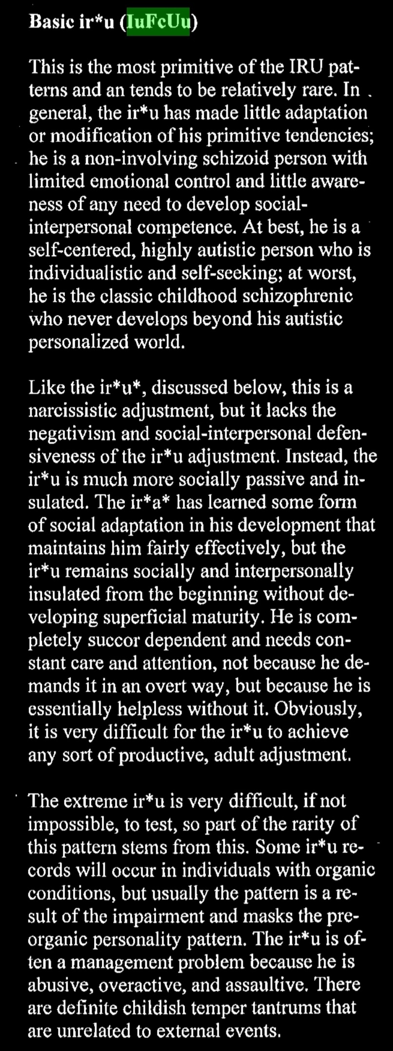 >IuFcUu>non-involving schizoid person with limited emotional control and little awareness of any need to develop social-interpersonal competence.>At best, he is a self-centered, highly autistic person who is individualistic and self-seeking; at worst, he is the classic childhood schizophrenic who never develops beyond his autistic personalized world.>He is completely succor dependent and needs constant care and attention, not because he demands it in an overt way, but because he is essentially helpless without it.>Obviously, it is very difficult for the ir*u to achieve any sort of productive, adult adjustment.Damn, tell me how you really feel.