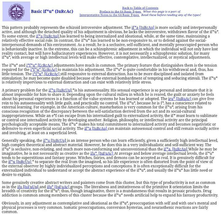 >>41409683The convergent/basic iru cluster (i.e. adjustments that became iru during adolescence) is generally less favorable. >The major difference between the conver-gent ira and conventional iru clusters is inthe area of social-interpersonal behavior. Inone way or another, the basic ira makes someform of social adjustment or commitment.This is rarely true for the basic iru; he tends tobe oblivious toward, or insulated from, so-cial relationships. He is much more inter-ested in the world of things and proceduresthan in the world of people. At best, this isa schizoid adjustment; at worst, it is trulyschizophrenic.Other generally unfavorable ones: e*r*u*, if*u, er*u.