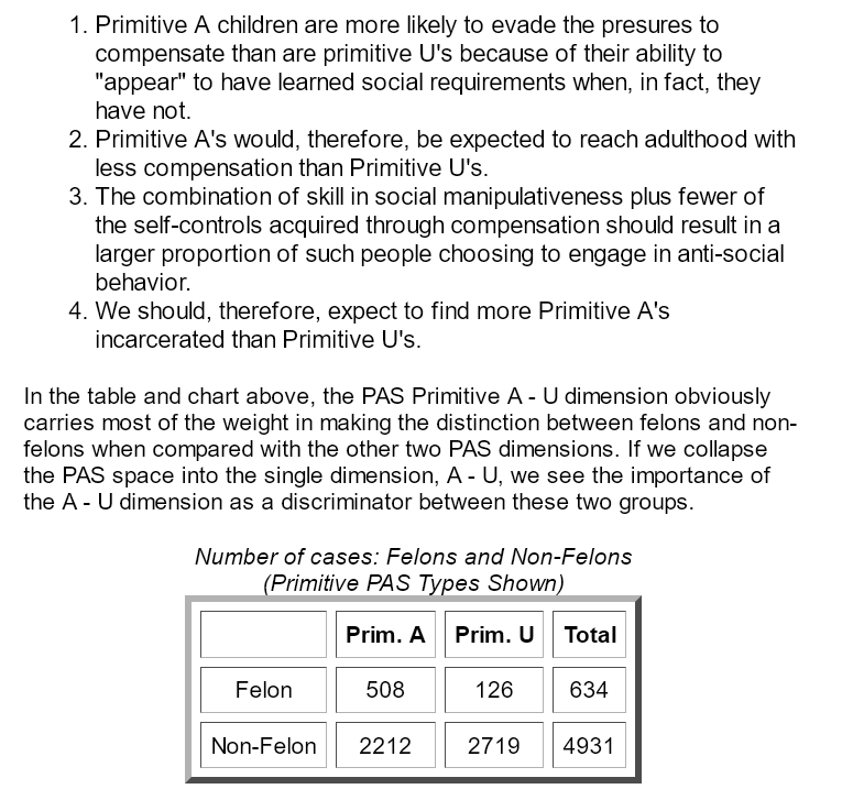 >This is the most primitive of the basic adjustments derived from the primitive EFU cluster. The er*u remains extremely affective with little mature control of his emotions. The er*a* [EuFcUc] has made some type of adjustment that helps him to maintain emotional control even though he is still susceptible to episodic states that are affective and confusing. The er*u is much more spontaneously and continuously active, emotional, and erratic. His general personality is one of "nervousness," over-reactivity, and inferiority. Many immature personalities are found in this cluster; it is rare that the er*u will make even temporary satisfactory adjustments, a possibility still open to the er* a. Childhood nervous diseases such as chorea are common; even when outright illness is not obvious, the er*u is considered strange, peculiar, and erratic. Poor progress in school is common and marked intellectual inferiority is characteristic.>Moodiness is a primary characteristic of this adjustment and, as might be expected, extremes are very common. To a large extent, this is the classic manic-depressive adjustment. Over activity (manic episodes) and morose depressions are not uncommon; the periods of remission are intervals during which the individual is tensely compulsive or rigidly over-controlled. Obviously, the er*u has very limited tolerance for stress and in some of the surface manifestation, he is tensely blank, non-responsive, and inoperative.>In general, the er*u is probably one of the most uncomfortable adjustments a person can make because of the intensity of the feeling, the bewilderment of the frequency of rejection, and the uncontrollability of the emotion. Alcoholism and drug addiction, when it occurs in the er*u, is particularly disabling because of the severe emotional reaction that are precipitated.