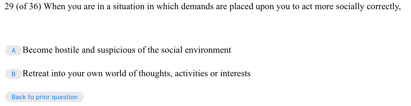 >>41419760an example of the questions i'm referring to. neither option describes me. i am generally good at masking when out in meatspace with the npcs.