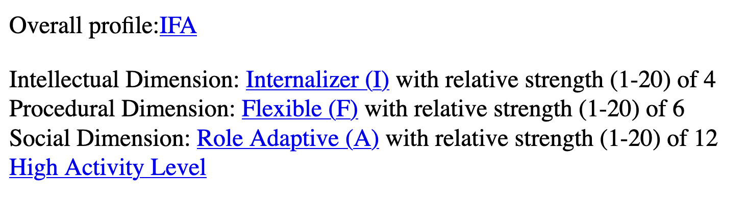 >>41419570Hi twin. I'm only off by one letter. One of the main things that I agreed with in my assessment is my intensity. There were many questions that were somewhat tough to answer because (a) I can do it (b) I don't want to do it. However, since it asked more about childhood when I was a little more caring about fitting in, it was easier. I want learn more about the theory behind this. I saw that it describes personality as a matter of aptitude. I feel like I have too much aptitude and not enough purpose.