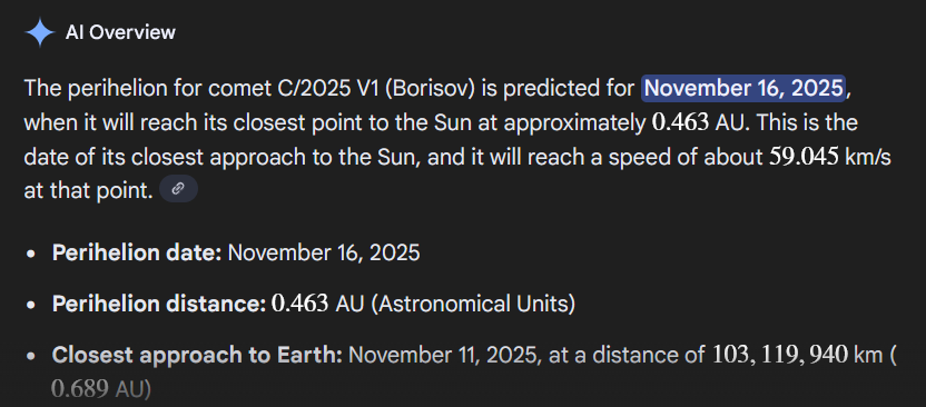 >Probability of being mostly masked from Earth’s view by Sol's glare at perihelion on October 29, 2025.