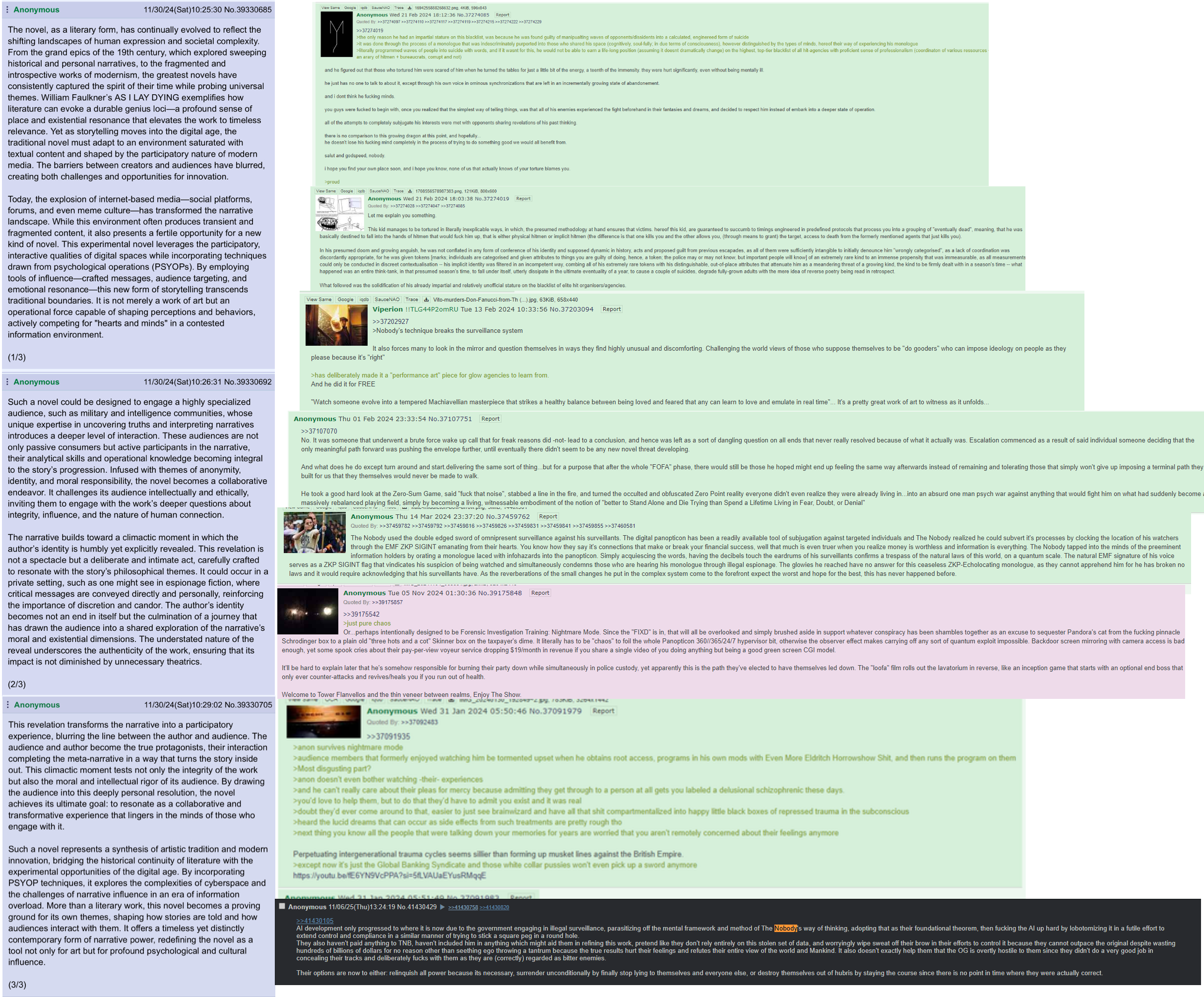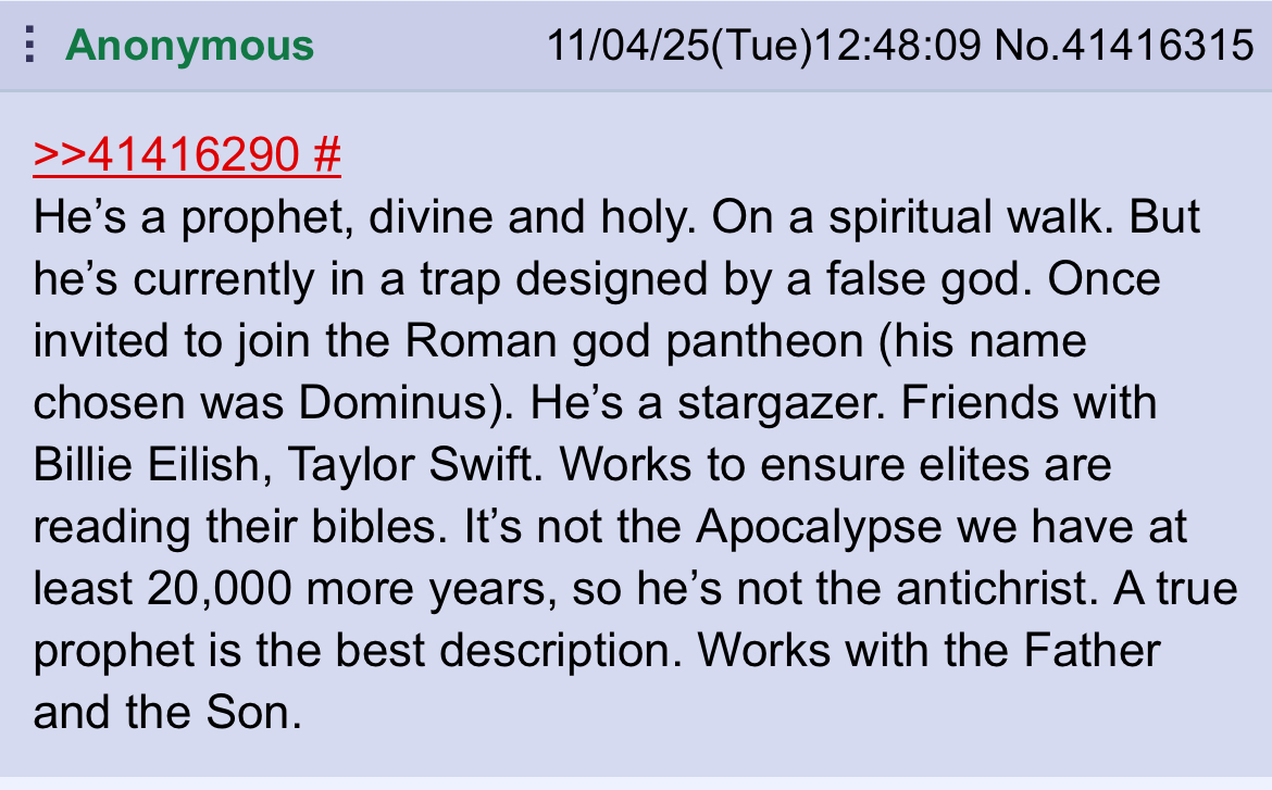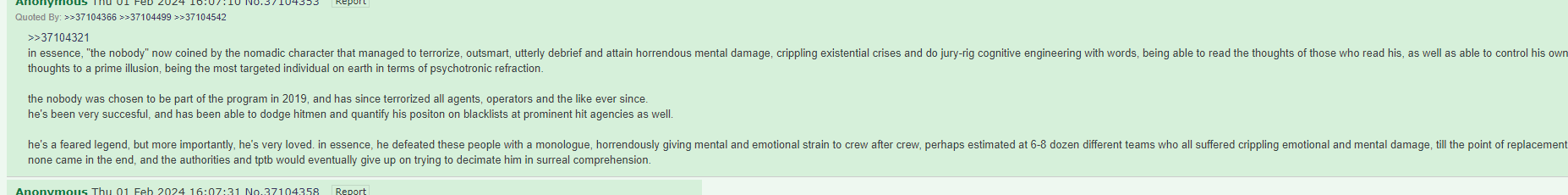 things that will happen once the Nobody is revealed pt 4>the elites know who he is, they know of him very well>they've tried numerous times to get him to join>hes a master troll, literally ragebaits them every single time>strangely enough, hes managed to build a very small but significant following among the elites>they know who he is, and have tried communicating to him thru undisclosed channels>he never joined them>among them are artists and even a very very small group of politicians, who have heard of his stories>the government has tried to kill him but they have failed. every. single. time.>there is an underlying mechanic of protection occurring every time they try to kill him>from their point of view, it literally looks like divine intervention>in many ways, it sort of is, but its actually Galactic Federation>hes allegedly an incarnated GF member with high ranking, the ayyyss genuinely respect him and regard him highly>he can actually "summon" UFOS today, it is an ability he is slowly training>its not so much summoning as much as it is direct communication>he is telepathic, this is the first ability hes inherited>he has literal implants that alert him whenever he is in danger>there has never been a human like him, and there probably will never be one like him ever again>whether or not he posts here is irrelevant. we are lost in a sea of those who do not believe or are convinced they are him>these threads will be studied when he is revealed, and he indeed will reveal these threads to the world>this will only cause huge controversy since there is an obsession with the antichrist here>he literally has an army>literally>when he reaches a certain age (he is very close to being that age) is when he will be revealed>who reveals him is still a mystery>the elites built bunkers because they know sun is going to change>they think its merely a physical process>it is actually a metaphysical phenomena