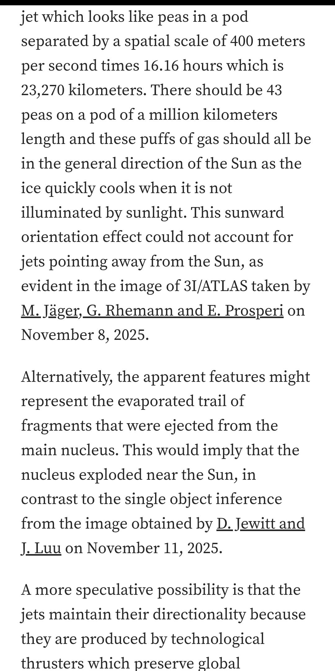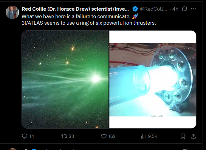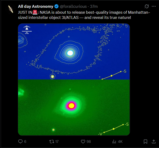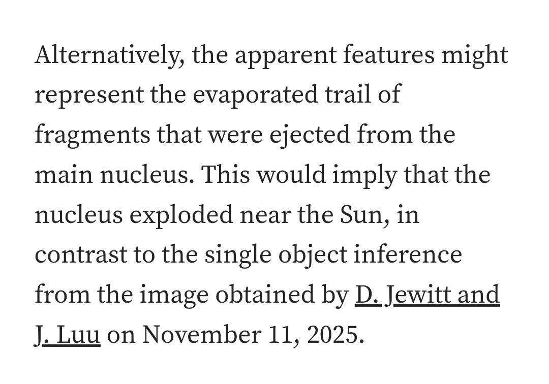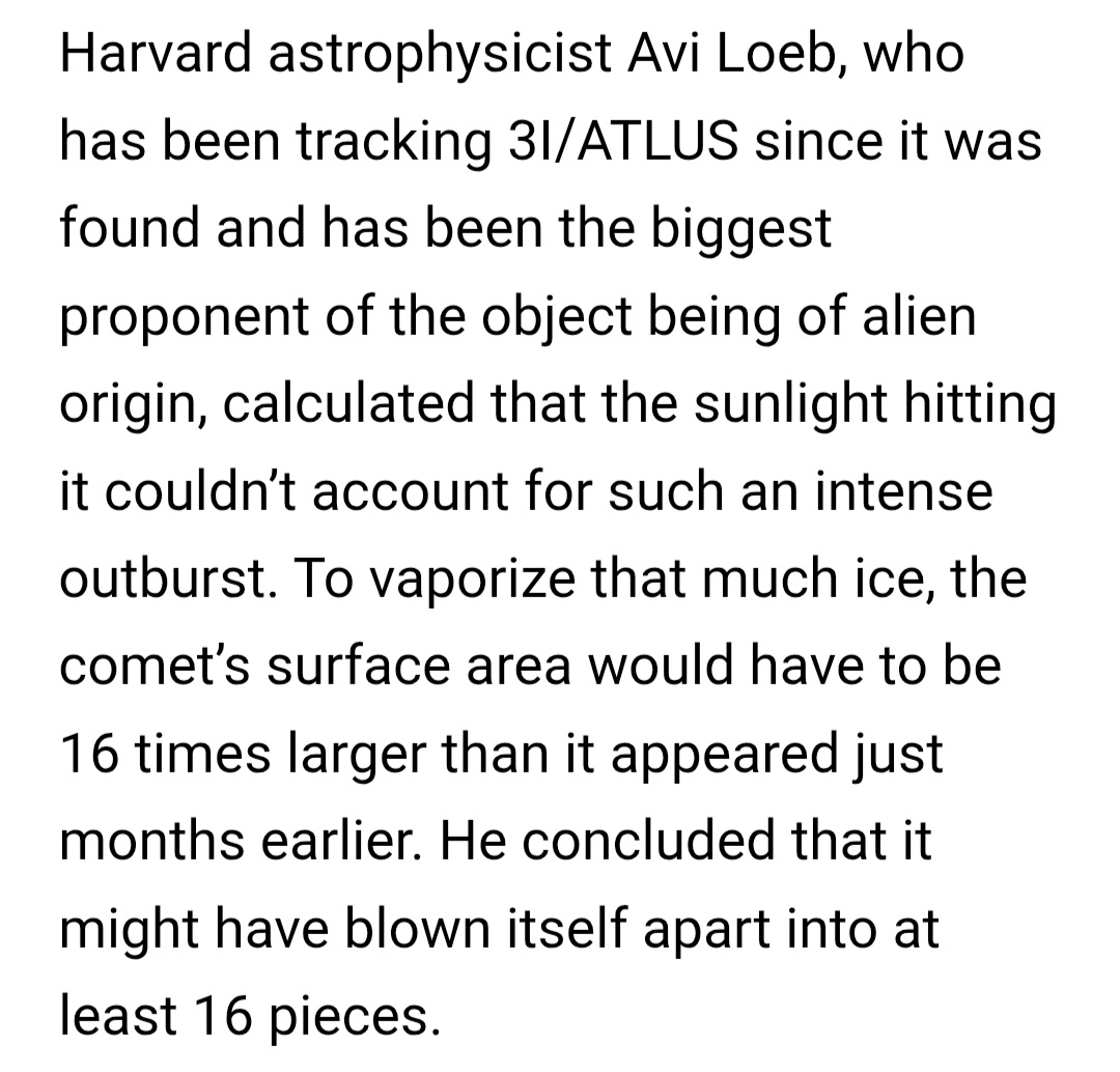Previous: >>41491000>Trackers:https://theskylive.com/3dsolarsystem?objs=c2025n1https://ssd.jpl.nasa.gov/tools/sbdb_lookup.html#/?sstr=C%2F2025%20N1&view=VOP>latest:Ray from Ray's Astrography confused by recent images it seems - https://www.youtube.com/watch?v=iXNvasoycEo>Confirmed Anomalieshttps://youtu.be/m40gXjIu1x8>Estimated size:1-5km diameter probably more>Estimated Mass:33 Billion tons>Probability of retrograde inclination of 175.11°, almost perfectly aligned with the solar system:0.2%.>Cumulative probability of making close approaches to Venus, Mars, and Jupiter:≲0.005%.>Probability of the object being masked from Earth’s view by glare at perihelion:7%.>continued silence from all space agencies>Check the zeitgeist of /pol/ and /x/:https://schizodot.wtf/>Other oddities:The IAA SETI post-detection protocols just updated first time in 15 years https://arxiv.org/pdf/2510.14506Size and weight of 3i/Atlas are only estimates.3i/Atlas deviated its course and speed after perihelion.Many UAP's have been sighted since 3i detection - use https://apokalypsis.net/ for Europe and https://ufobattler.com/ or https://nuforc.org/map/ for America/otherNASA caught manipulating data on its Solar Observatory website.Growing magnetic field anomaly in south Atlantic regionFAA updated its air traffic control handbook to include UAP reportingCassandra Space System Report:https://medium.com/@earthexistclothing/3i-atlas-cassandra-unclassified-799785fc42capastebin of useful links for random ayys info - https://pastebin.com/LCzTq0w5>sauce:YouTubehttps://www.youtube.com/@DiegoSanAraujohttps://www.youtube.com/@DobsonianPowerhttps://www.youtube.com/@TheAngryAstronauthttps://www.youtube.com/@GaleriaDoMeteoritohttps://www.youtube.com/@StefanBurnshttps://www.youtube.com/@JohnLenardWalsonhttps://www.youtube.com/@CristinaGhttps://www.youtube.com/@RaysAstrophotographyAvi Loeb: https://avi-loeb.medium.com/Shiva Meucci: https://medium.com/@ShivaMeucci