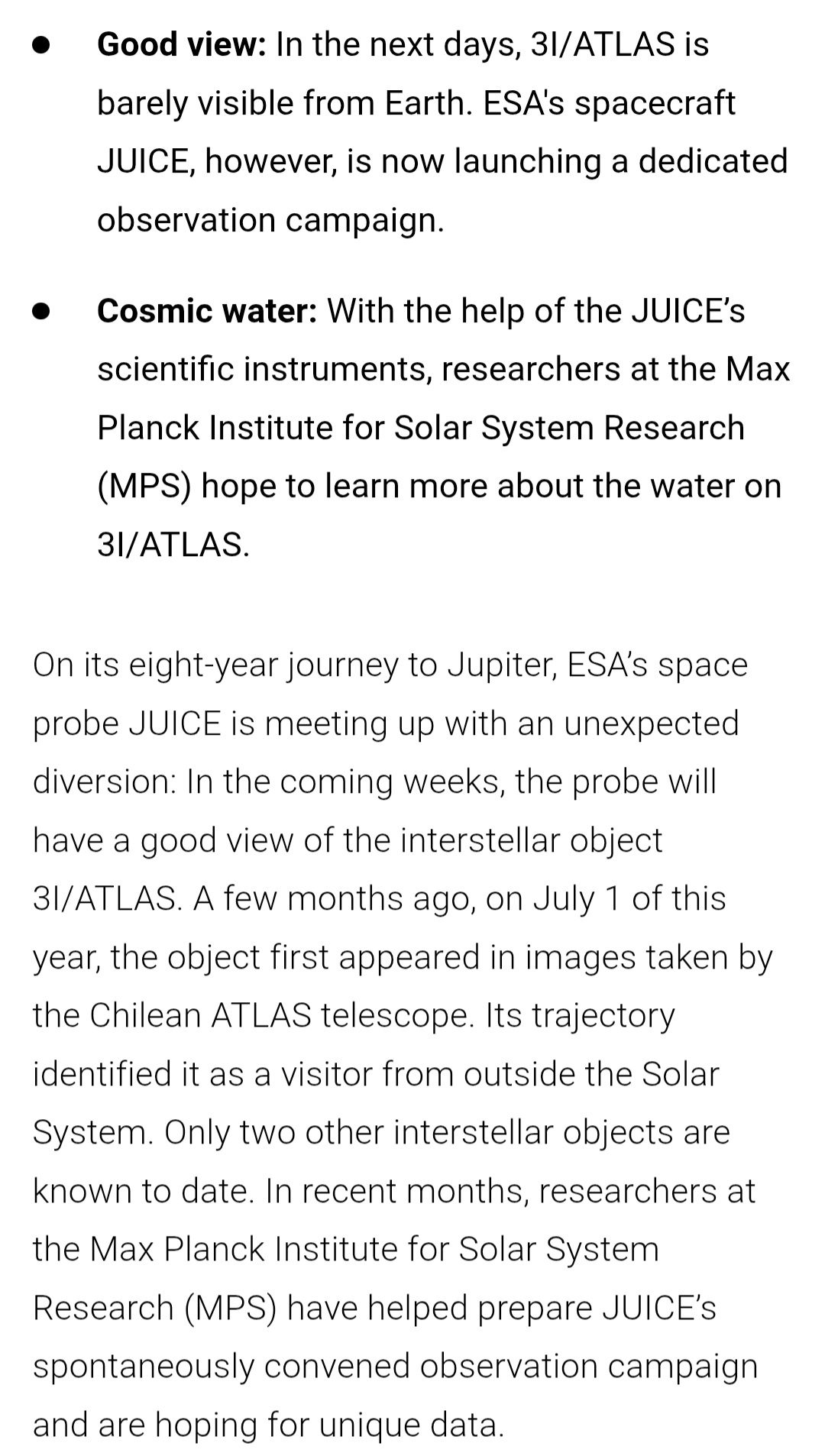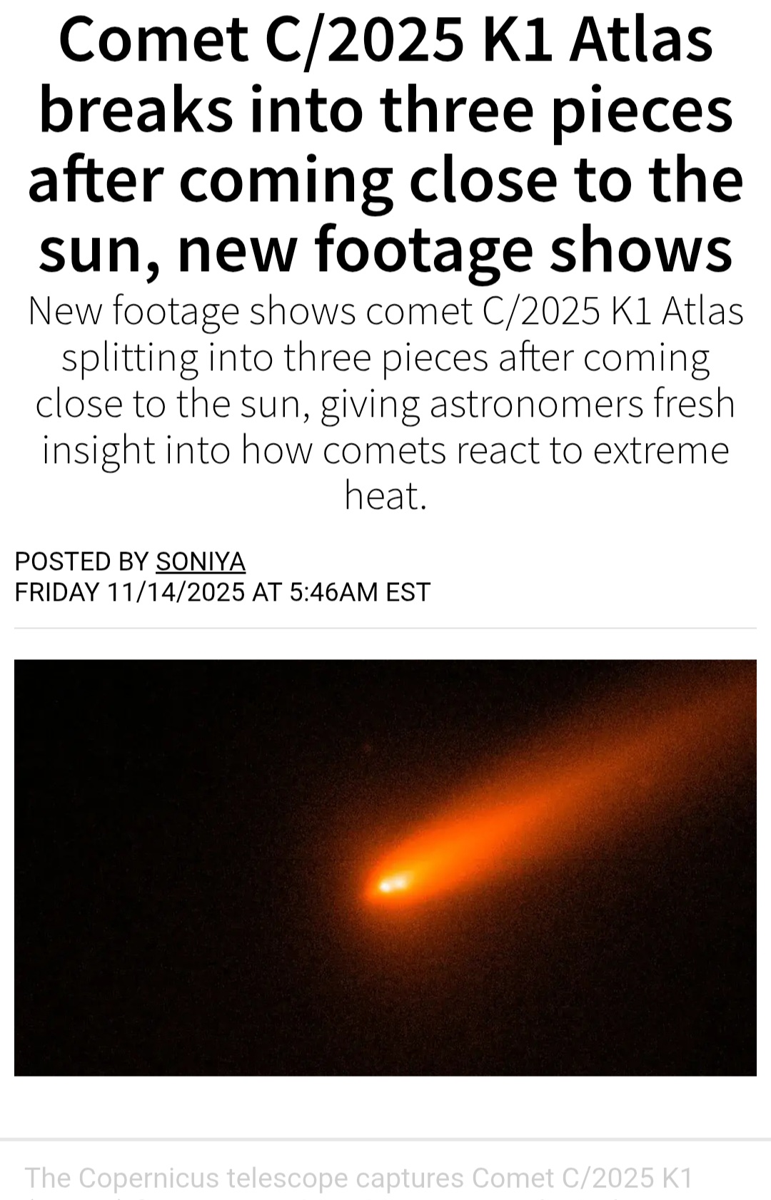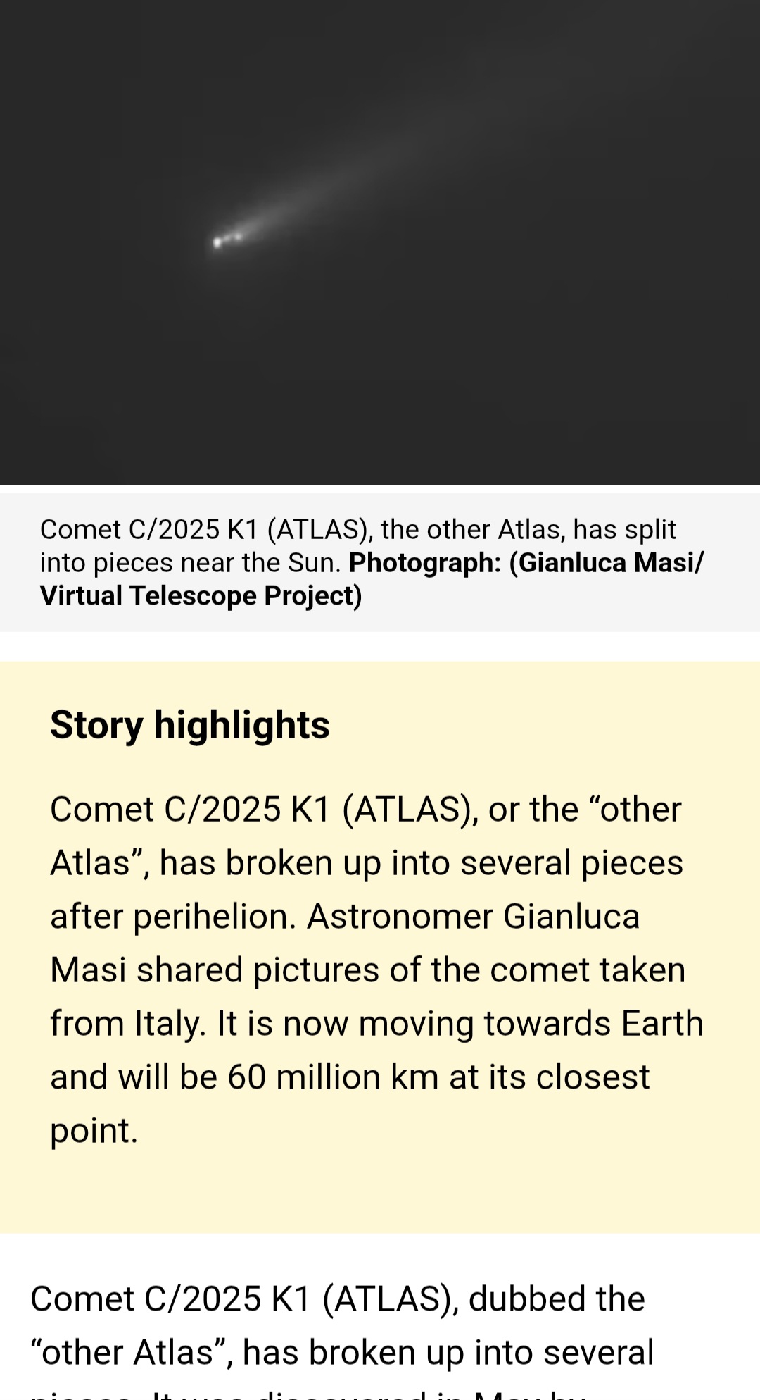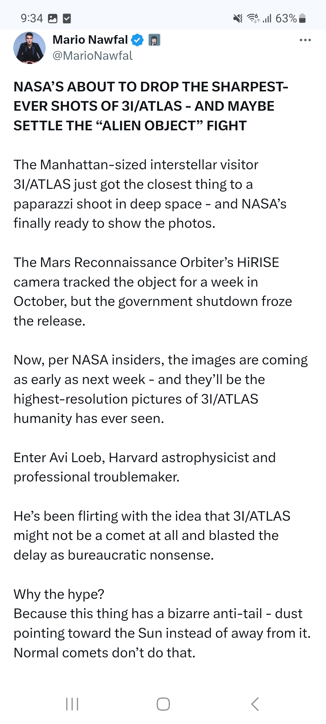 Previous: >>41491000>Trackers:https://theskylive.com/3dsolarsystem?objs=c2025n1https://ssd.jpl.nasa.gov/tools/sbdb_lookup.html#/?sstr=C%2F2025%20N1&view=VOP>latest:Ray from Ray's Astrography confused by recent images it seems - https://www.youtube.com/watch?v=iXNvasoycEo>Confirmed Anomalieshttps://youtu.be/m40gXjIu1x8>Estimated size:1-5km diameter probably more>Estimated Mass:33 Billion tons>Probability of retrograde inclination of 175.11°, almost perfectly aligned with the solar system:0.2%.>Cumulative probability of making close approaches to Venus, Mars, and Jupiter:≲0.005%.>Probability of the object being masked from Earth’s view by glare at perihelion:7%.>continued silence from all space agencies>Check the zeitgeist of /pol/ and /x/:https://schizodot.wtf/>Other oddities:The IAA SETI post-detection protocols just updated first time in 15 years https://arxiv.org/pdf/2510.14506Size and weight of 3i/Atlas are only estimates.3i/Atlas deviated its course and speed after perihelion.Many UAP's have been sighted since 3i detection - use https://apokalypsis.net/ for Europe and https://ufobattler.com/ or https://nuforc.org/map/ for America/otherNASA caught manipulating data on its Solar Observatory website.Growing magnetic field anomaly in south Atlantic regionFAA updated its air traffic control handbook to include UAP reportingCassandra Space System Report:https://medium.com/@earthexistclothing/3i-atlas-cassandra-unclassified-799785fc42capastebin of useful links for random ayys info - https://pastebin.com/LCzTq0w5>sauce:YouTubehttps://www.youtube.com/@DiegoSanAraujohttps://www.youtube.com/@DobsonianPowerhttps://www.youtube.com/@TheAngryAstronauthttps://www.youtube.com/@GaleriaDoMeteoritohttps://www.youtube.com/@StefanBurnshttps://www.youtube.com/@JohnLenardWalsonhttps://www.youtube.com/@CristinaGhttps://www.youtube.com/@RaysAstrophotographyAvi Loeb: https://avi-loeb.medium.com/Shiva Meucci: https://medium.com/@ShivaMeucci