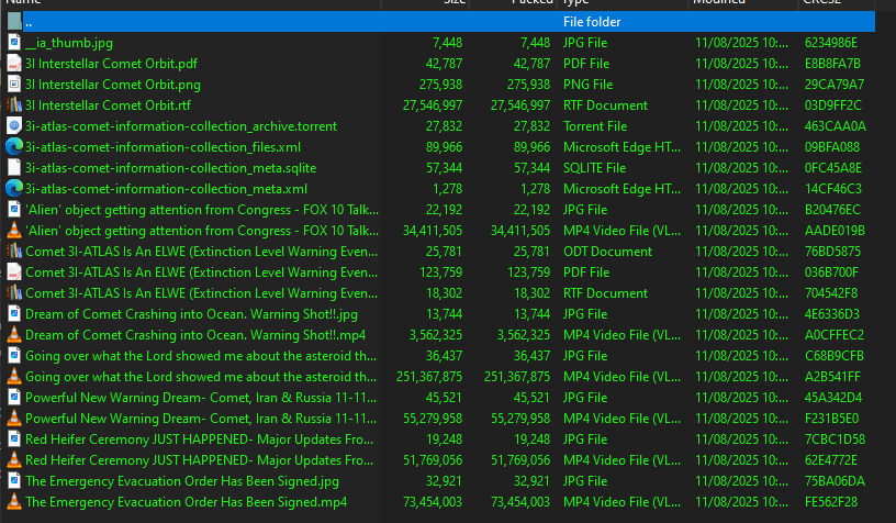 might just be a based schizo, here's a copy paste of the most detailed PDF, the rest appear to be offlined youtube videos about the mentioned contentComet 3I-ATLAS Is An ELWE (Extinction Level Warning Event)1. The Emergency Evacuation Order Has Been Signed (When / What that is - is Not Known)https://www.youtube.com/watch?v=apZG_MSBLmo2. Comet 3I-Atlas Will Pass By:https://www.youtube.com/watch?v=icZnR8J5IPk&t=36s3. Comet 3I-Atlas fragments will impact the Ocean.https://www.youtube.com/watch?v=Fu4CPgUUCCc4. Due to its INSANE relative velocity anything over 1 mile in diameter will easily trigger 10.0+ earthquakes. Relative velocity is currently estimated at 59km/s a 1 mile rock will generate a 100-300 meter tsunami, or 400 Megaton in equivalent. 100 km from the impact - wave height will still be 10-50 meters.5. Comet is under heavy scrutiny. It has glowing FRONT instead of trailing. However it has no evidence of molecules (indicating dust without gas which is very unusual - some suspect this is an alien shield.)https://www.youtube.com/watch?v=SJx99ssIw4M&t=283scont.