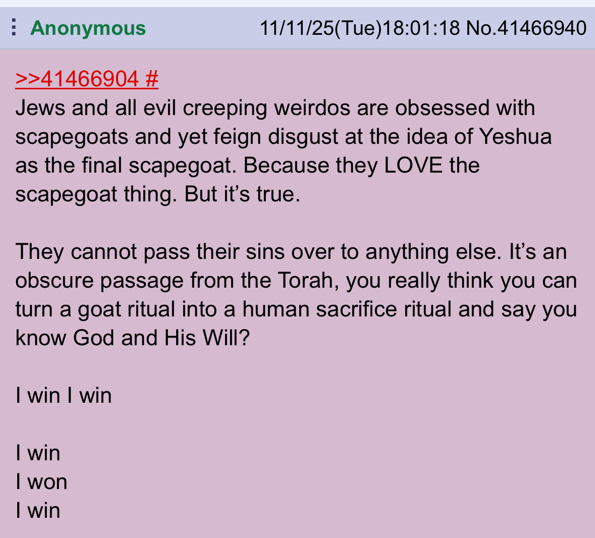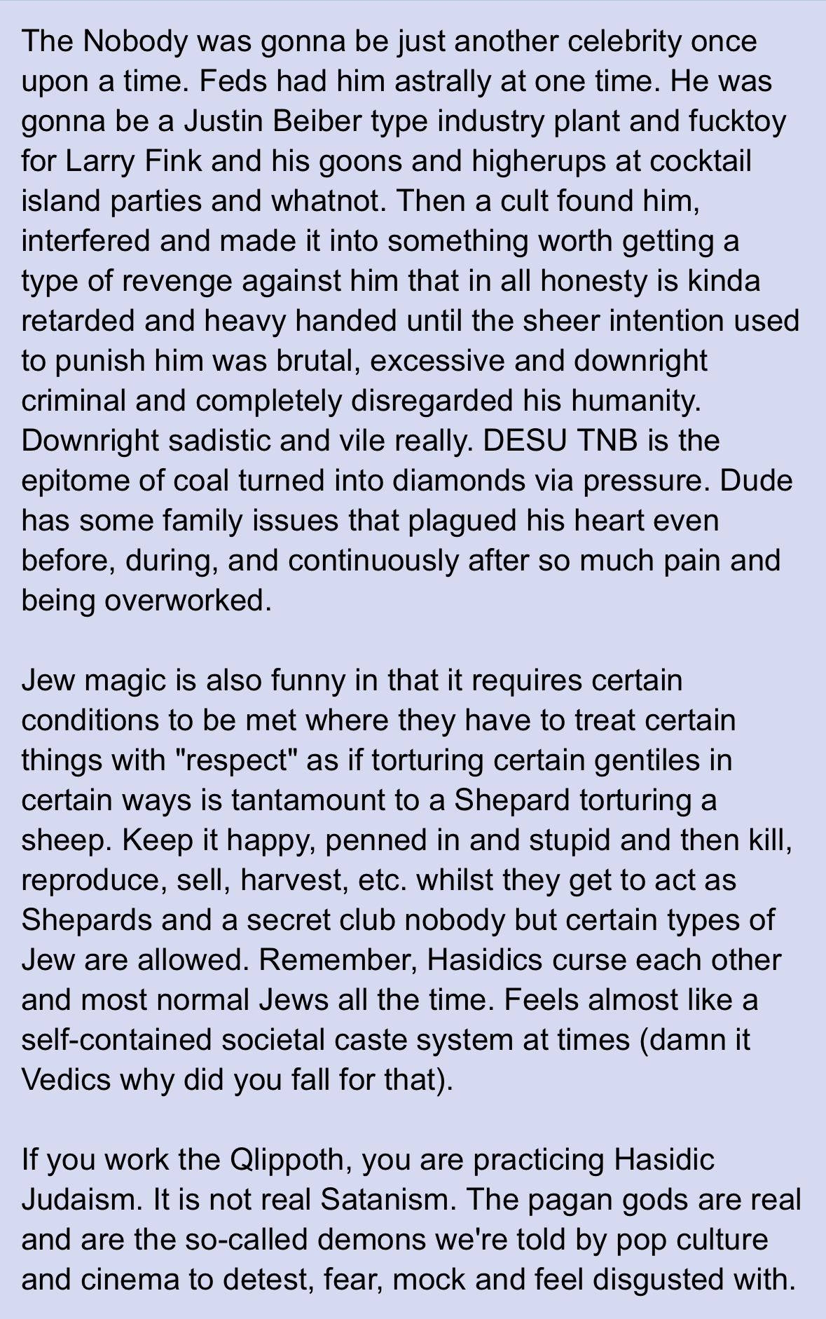 >>41496921Maybe it's because they're a bunch of cannibal pedophiles and the dude is just waiting for the opportunity to take the gloves off.All of this is hypothetical satire though of course we're just shitposting after all.