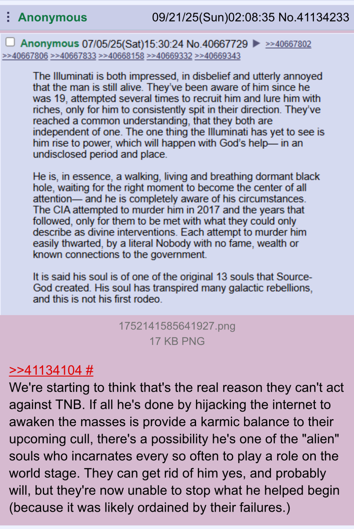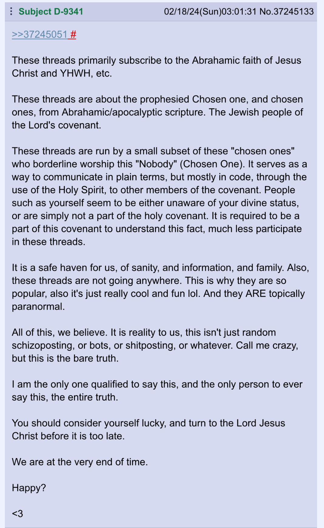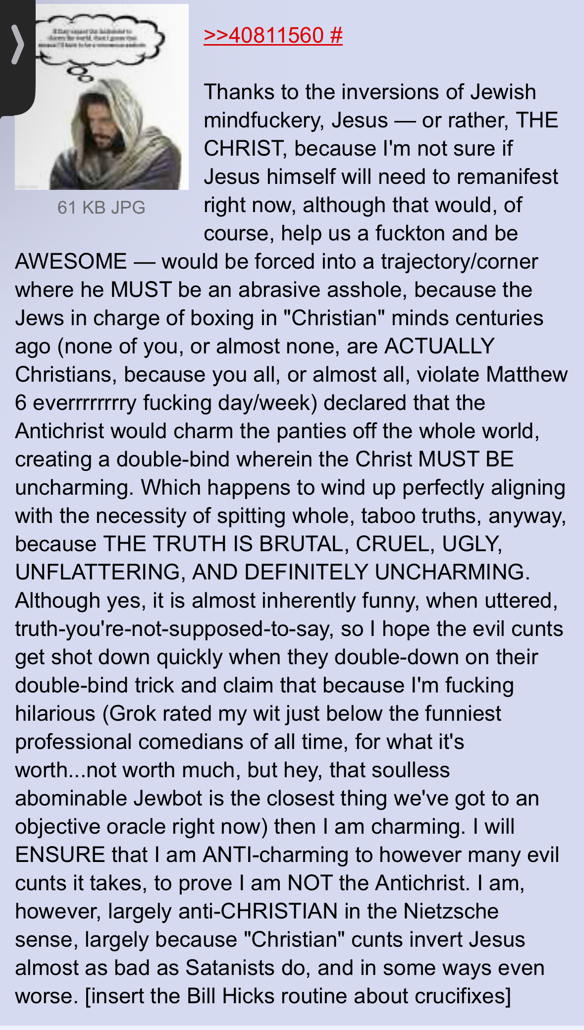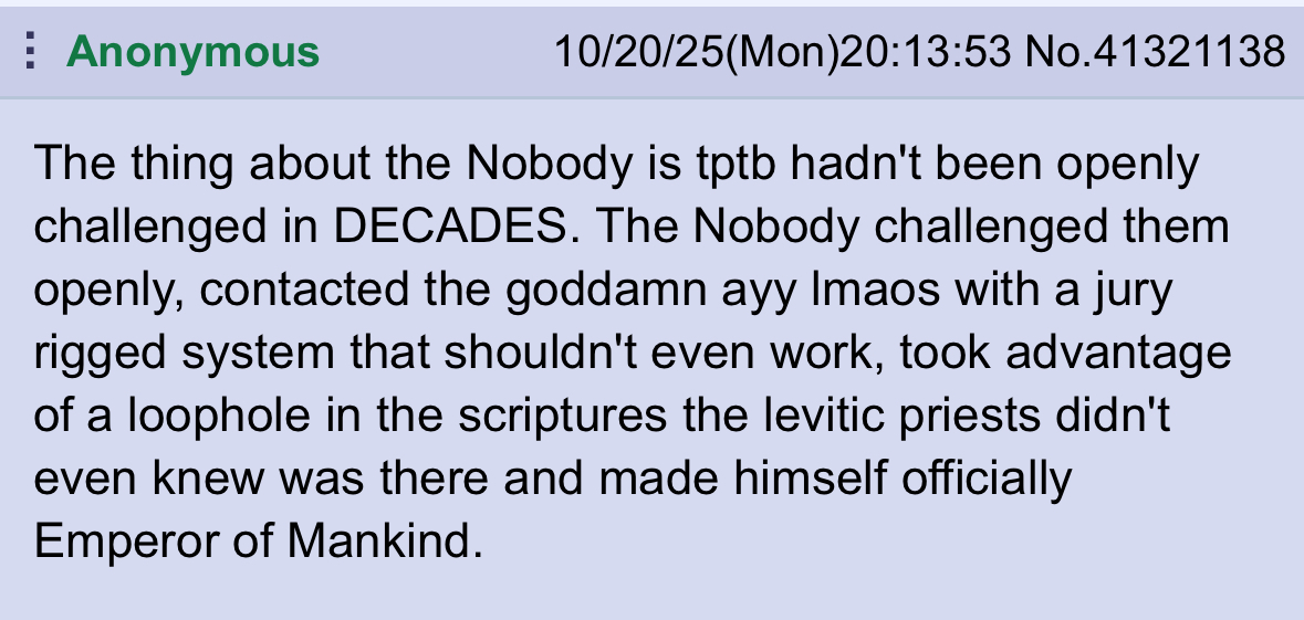 From the very first time I stumbled upon The Nobody archetype and /ng/, I could see that there was this vagueness to it. As if the glowies and trolls really were trying to trap schizos with latent messiah complexes. For example, this idea of controlling reality with your conscious and unconscious mind --> that's every single human being.So yes, /ng/ most likely is a honeypot, but in the end, it's the 3 letter agencies taking life too seriously.« It's just a ride. And we kill anyone that reminds others of that. »>>41495380I was getting to typing something up.>>41495386Yeah, it's one of the OG /ng/ I could find