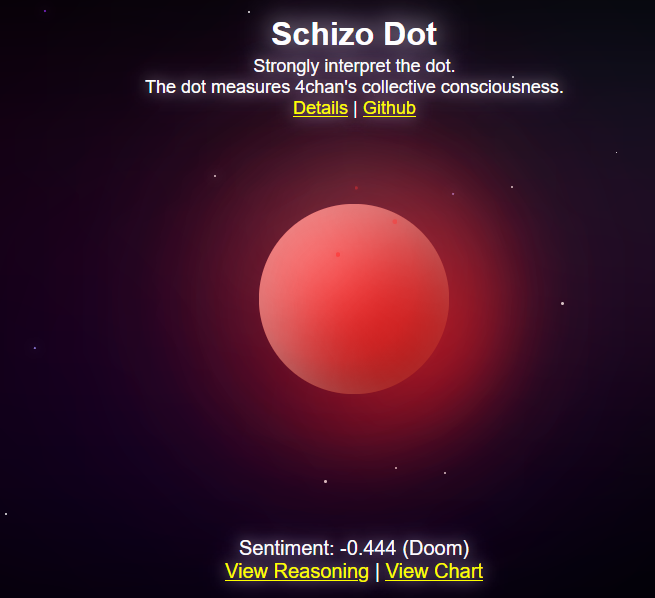 >>41524355At the time of this bake the schizo dot is registering:DOOMHave a pleasant morning, afternoon or evening wherever you may be