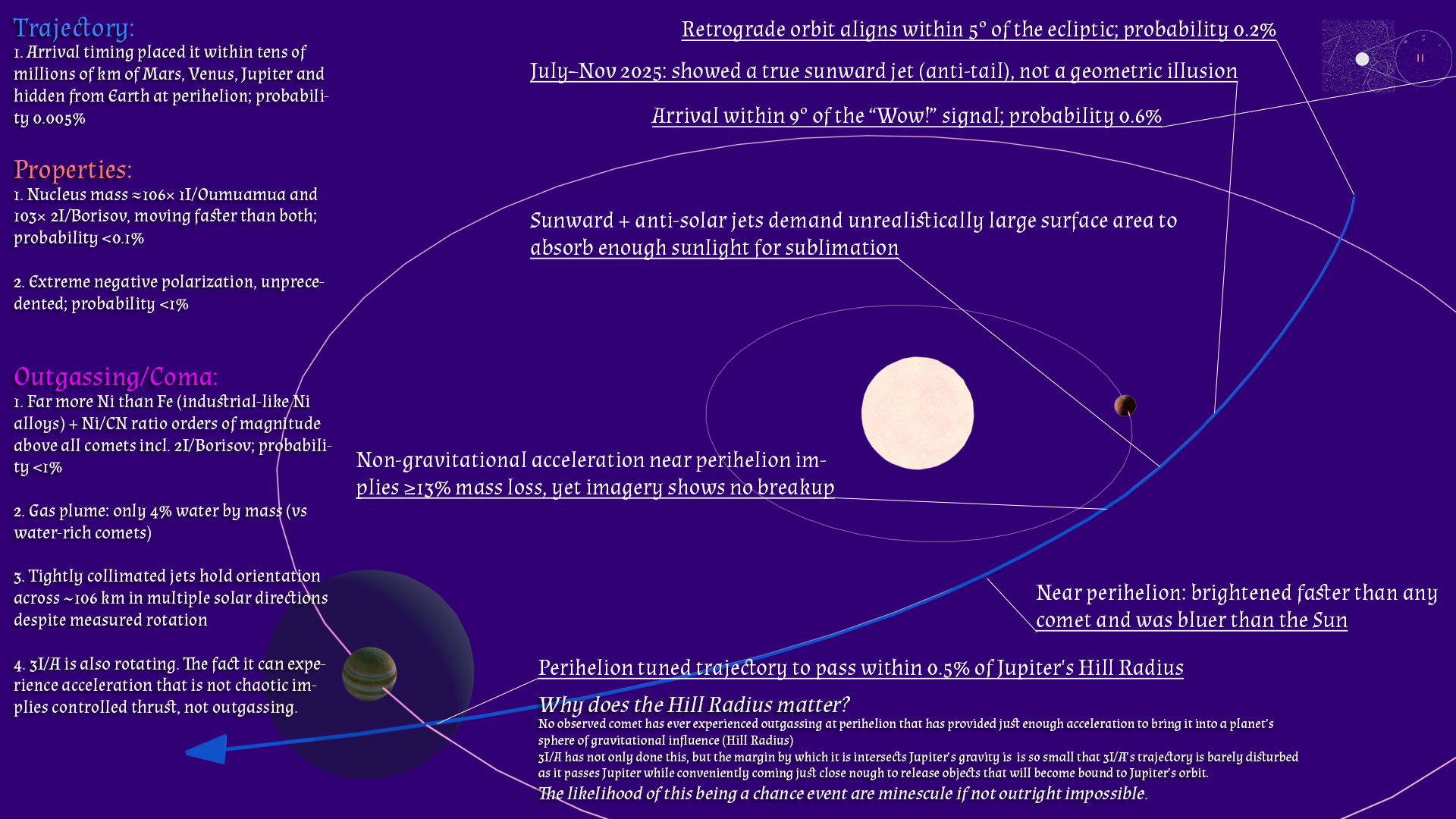 >4.Arrival timing placed it within tens of millions of km of Mars, Venus, Jupiter and hidden from Earth at perihelion; probability 0.005%