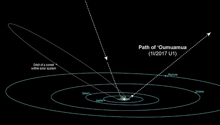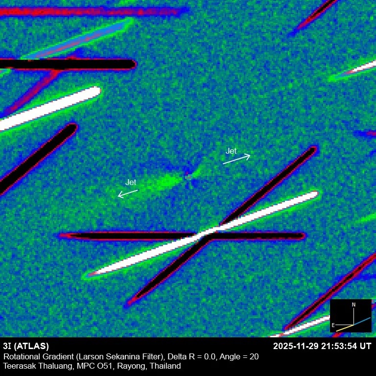 >Reminder that NASA is officially an intelligence agency>>41595859>Trackers:https://theskylive.com/3dsolarsystem?objs=c2025n1https://ssd.jpl.nasa.gov/tools/sbdb_lookup.html#/?sstr=C%2F2025%20N1&view=VOP>Lightcurvehttps://cobs.si/comet/2643/1.Retrograde orbit aligns within 5° of the ecliptic; p. [probability] .2%2.July–Nov 2025: showed a true sunward jet (anti-tail), not a geometric illusion3.Nucleus mass ≈106× 1I/Oumuamua and 103× 2I/Borisov, moving faster than both; p. <.1%4.Arrival timing placed it <10,000,000km of Mars, Venus, Jupiter and hidden from Earth at perihelion; p. .005%5.Gas plume: far more Ni than Fe (industrial-like Ni alloys) + Ni/CN ratio orders of magnitude above all comets incl. 2I/Borisov; p. <1%6.Gas plume: only 4% water by mass7.Extreme negative polarization, unprecedented; p. <1%8.Arrival within 9° of the “Wow!” signal; p. .6%9.Near perihelion: brightened faster than any comet and was bluer than the Sun10.Sunward + anti-solar jets demand unrealistically large surface area to absorb enough sunlight for sublimation11.Non-gravitational acceleration near perihelion implies ≥13% mass loss, yet no breakup12.Tightly collimated jets hold orientation across ~106 km in multiple solar directions despite rotation13. Perihelion tuned trajectory to pass within .5% of Jupiter's Hill Radius14. No dimming since perihelion15. 16-hour brightness pulse>Oddities:The IAA SETI post-detection protocols just updated first time in 15 years: arxiv.org/pdf/2510.14506Many UAP's have been sighted since 3i detection - https://apokalypsis.net/ - ufobattler.com/ - nuforc.org/map/NASA caught manipulating data on its Solar Observatory website+image metadataFAA updated its air traffic control handbook to include UAP reportingChina Academy of Sciences changes name of Aeronautics Dept. to "School of Interstellar Navigation"US announces "Genesis Project" with 90-270 day timeline
